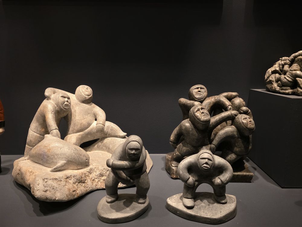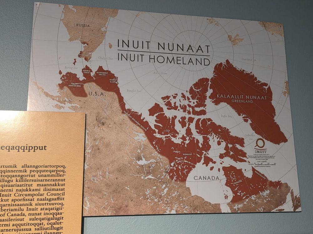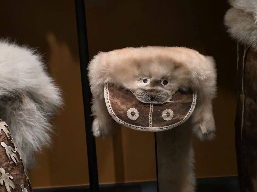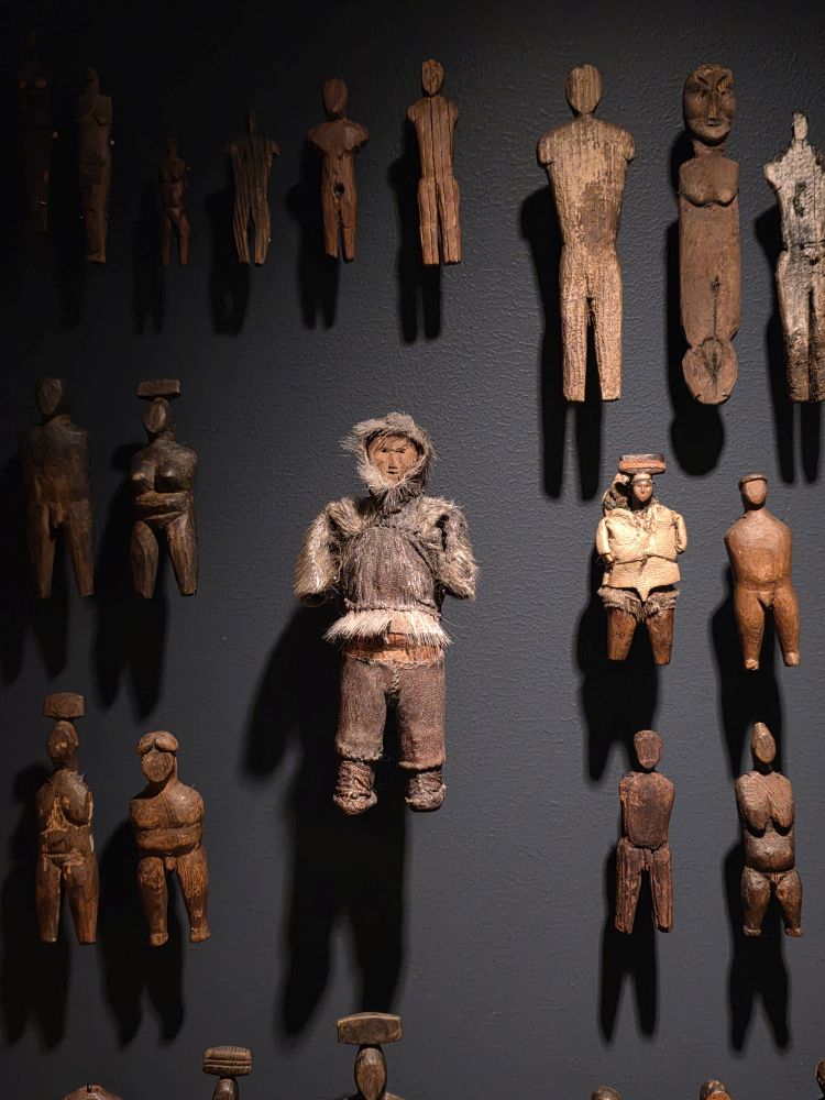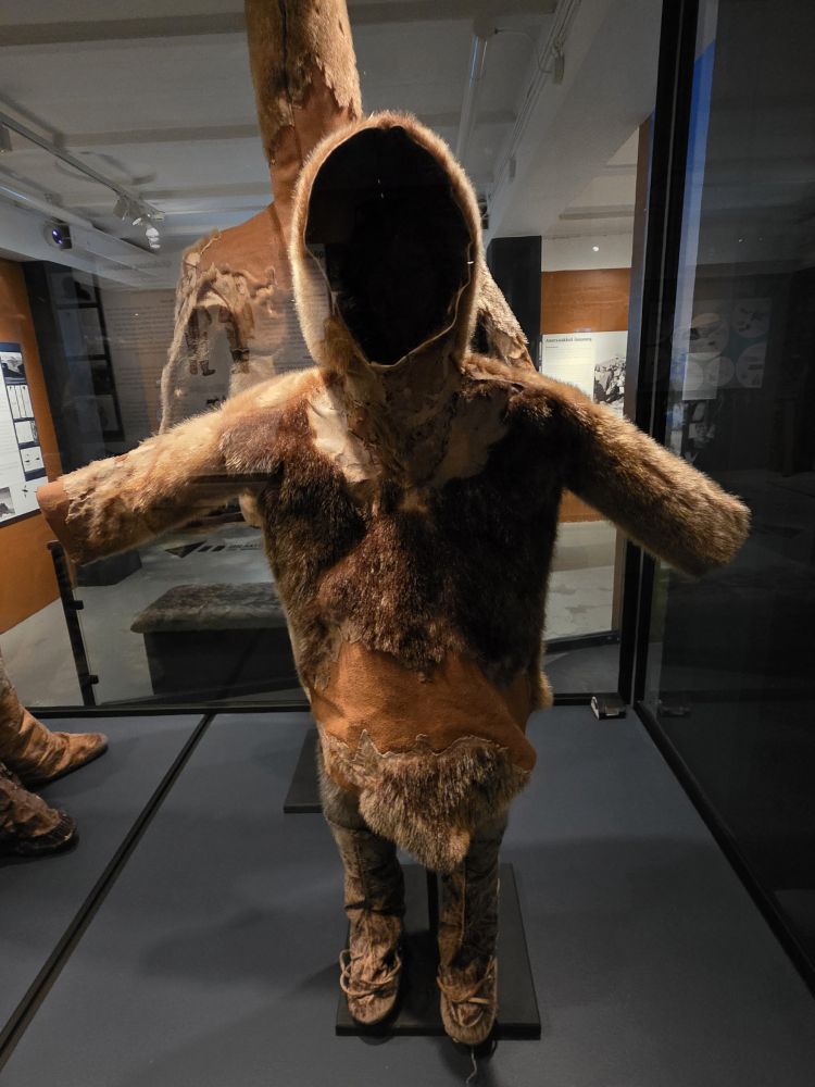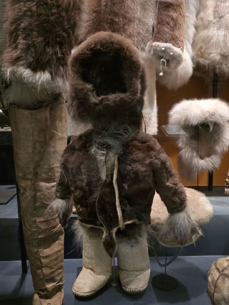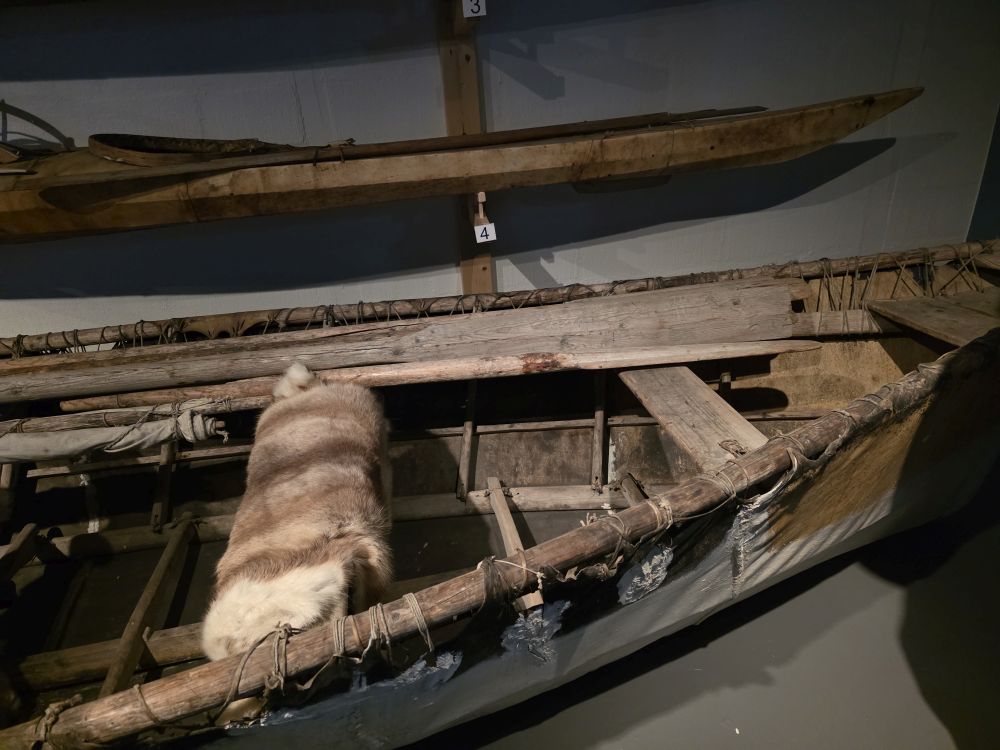 The National Museum opens promptly at 10, and bonus! It is free for all today. Nice. We are first in to explore the different buildings and exhibits ranging from Ancient People to Recent Times. There are examples of Arctic Farmers’ homes, complete with their hunting spoils, great maps detailing the Innuit people territory all over the world – graphically showing how close the Canadian Innuits are to the Greendlandic Innuits. Explanations of the Thule people, the ancestors of current day Innuits who arrived here – and in Alaska and Canada – around 1200 AD. There are old dolls, and jewelry, and handmade belts and incredible seal, reindeer and bird skin lined clothes – including the adorable little kid’s jacket and the cute fox head (we think?) hat. Plus, a massively huge kayak – actually boat – frame along one side of the room.