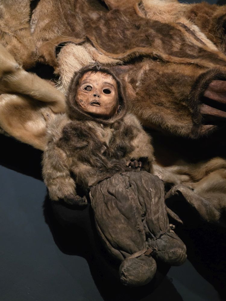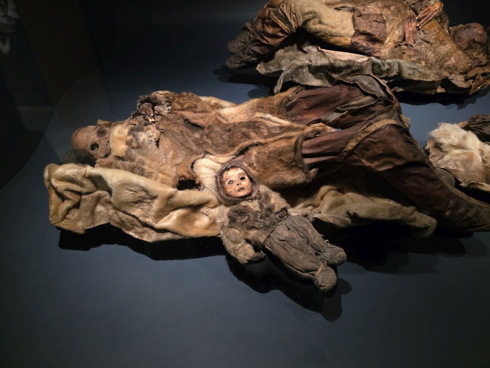 But probably the best, most fascinating exhibit is the Qilakitsoq mummies. These 4 mummies were found along with 4 other bodies, encompassing 3 generations of close familial ties. They were buried around 1475, wrapped in fur and fully dressed. Discovered in 1972 and then exhumed in 1978, these mummies are amazingly preserved. The details you can see! The hair on the baby, the fingernails on the women, the facial details. The oldest preserved remains in Greenland, they were essentially freeze-dried and now preserved here in the museum. Because of the incredible preservation, archeologists and scientists have been able to learn an immense amount about the Thule people’s life in the 1400s – how they lived, ate, hunted – amazing. While there isn’t much information on how they died, there is speculation that maybe the baby didn’t die naturally, but was buried alive with its dead mother. In the Innuit tradition, a tribe might suffocate or inter a child alive with its mother if they could not find another woman to care for it. Wow.