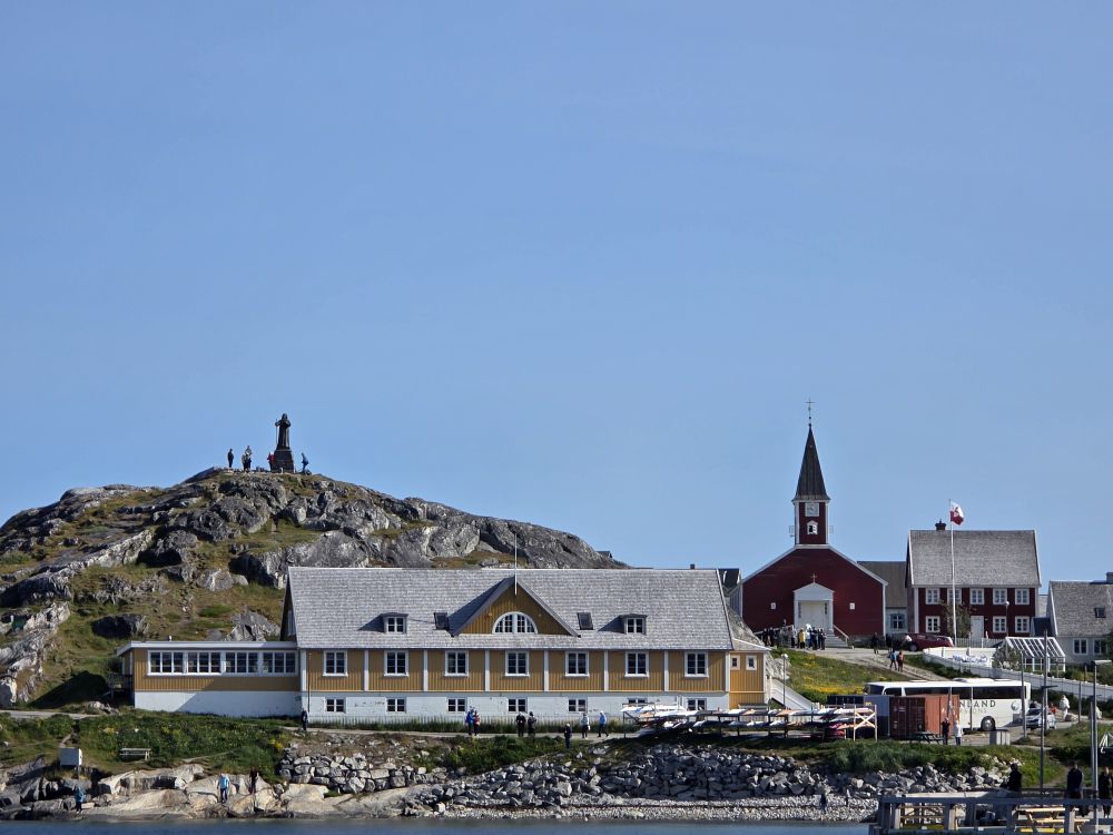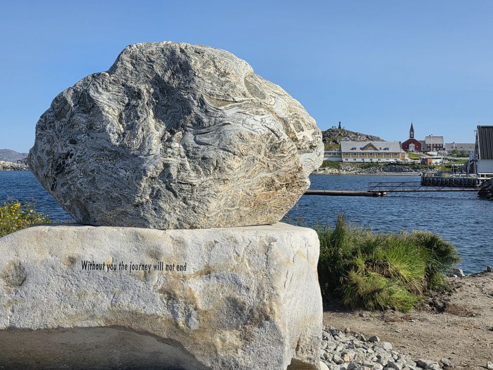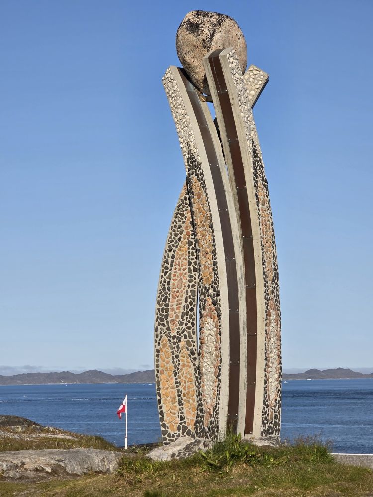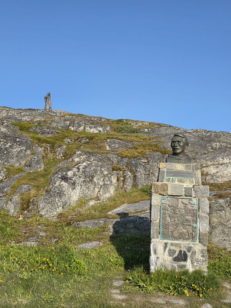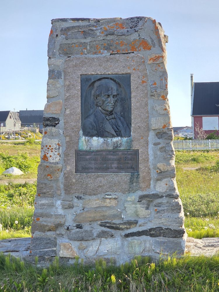We are, of course, too early for the Cultural Center which opens at 10, so we head down into old Nuuk where the Church of our Savior and the Hans Egede statue are located, passing another cool sculpture at the top of the cliff leading down to the waterfront, as well as the monument to Dr. Hinrich Johannes Rink, a Danish geologist and pioneer of glaciology, and a bust of Jonathan Petersen, the Greenlandic songwriter who composed the music to the national anthem. They have statues and monuments for everyone!!!