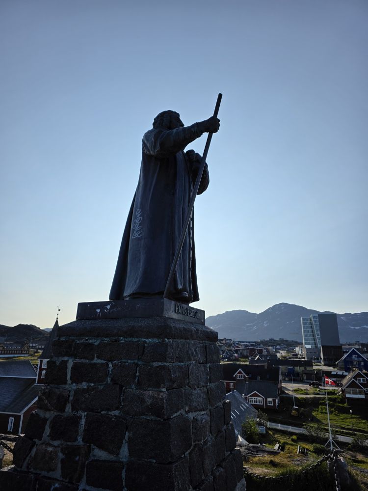 Arriving at the church, we find it closed for a funeral, which is fine by us – it is picturesque enough outside for photos. And since we are so early, we are all alone to snap as many beautiful empty pictures as we want! From here, we mountain goat our way up the rock mountain to gaze at the very backlit Hans Egede statue – as well as to enjoy the panoramic views across the town.