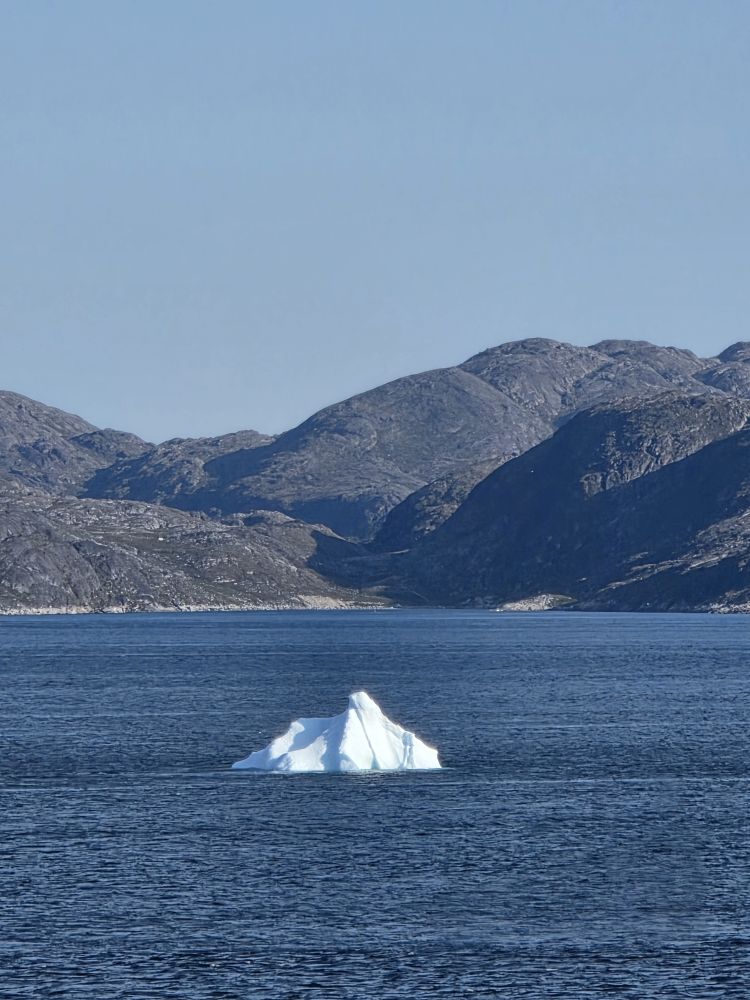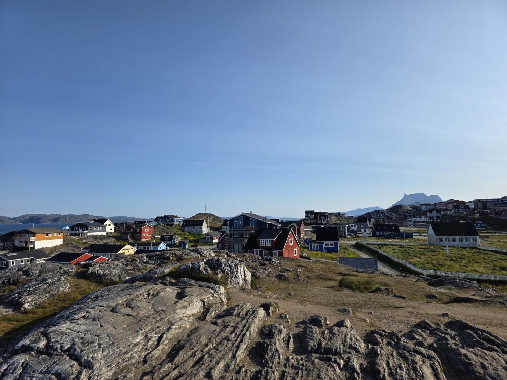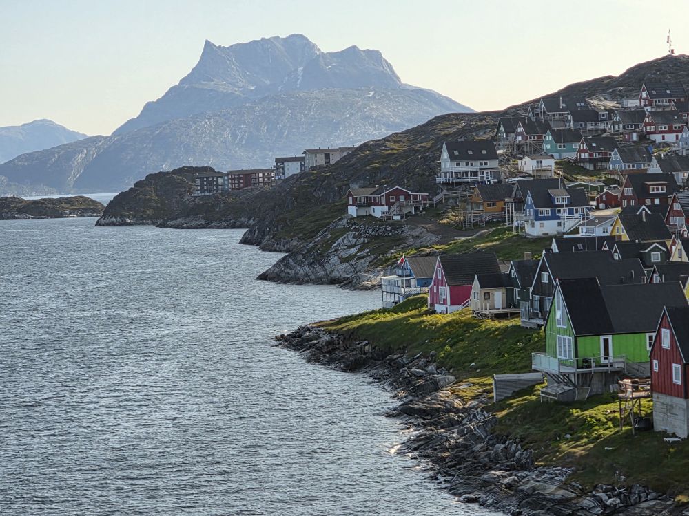 As we start to descend, I look at the map and actually find the Myggedalen viewpoint that was listed on the Nuuk overview the ship provides. Don’t know why it didn’t show up when I searched for it earlier, but nonetheless, it is a quick 10-minute walk away. We’ve still got plenty of time, so off we go through a little local neighborhood of pretty houses perched on a cliff up above the bay. Supposedly more beautiful at sunset – which we will not see here tonight – the daylight view is pretty amazing to us. You can see all the way across the bay and up into the fjord as well as the coastline of the city – with the vibrantly painted houses all along the craggy shore. It is just lovely up here, with ravens flying around and the lone iceberg floating out in the bay – and we are totally alone, a fabulous sleepy Sunday in Nuuk.