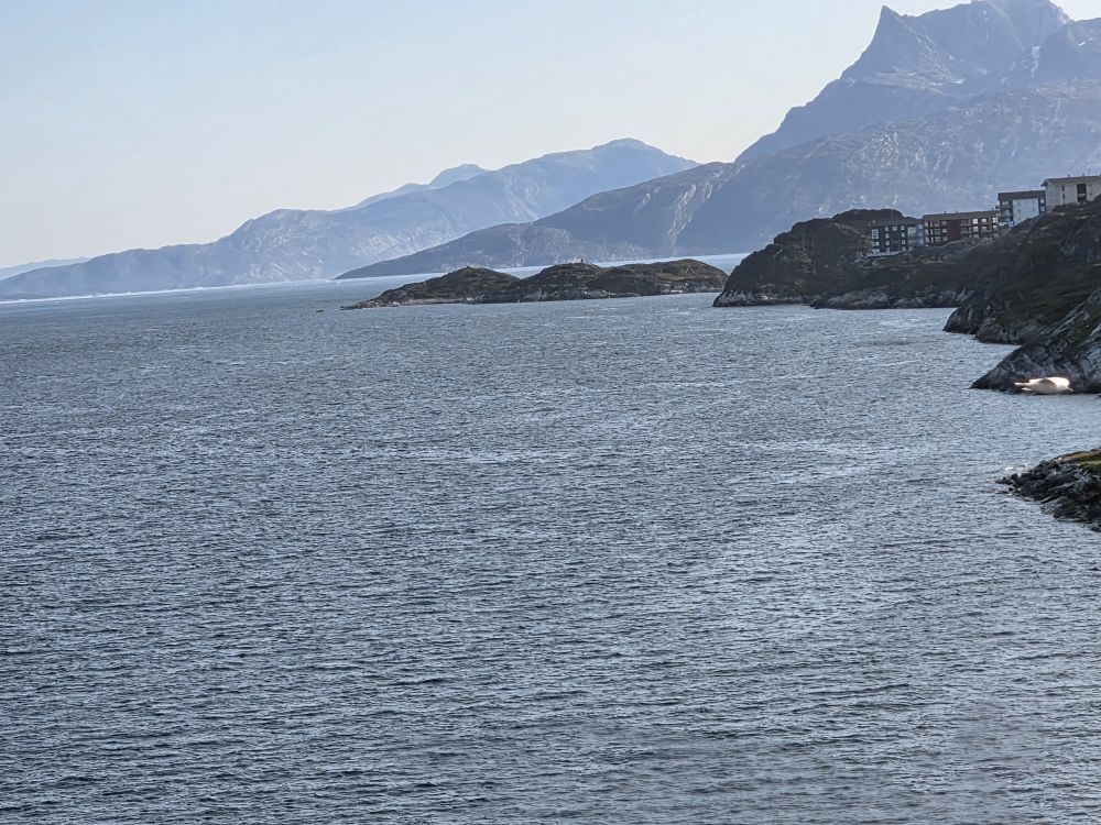 It is a brilliant sunshiny not a cloud in the sky day today. Perfect for a day of wandering around town, hitting museums and trying to find all the artwork scattered around the largest town in Greenland. We are up, in the gym, breakfasted and ready to go way too early for the first shuttle at 9 – so off we go on our trek into town. The weather is supposed to be a balmy 60 degrees today, but at 8a? Oh now, more like 45 degrees! We’re dressing in our puffy coat layers for certain. And wise decision that! It is still freezing out here – cold weather gear is an absolute necessity.