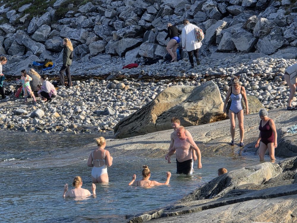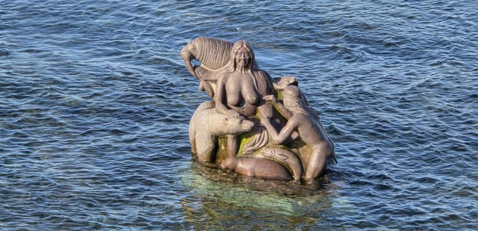 Heading back to the old harbor area, where the museum is located, the ship passengers have arrived! Our once empty streets are now virtually teeming with people. Ah well, we had our peace, now we will coexist! Back down at sea level, in front of the Hans Egede statue mountain, we find the Mother of the Sea statue – depicting all her mammal offspring from the legend. We also encounter a huge group of Europeans (Swedes? Danes? Greenlanders? We don’t know) taking a polar plunge! OMG – not a chance in hell would we ever do that, we barely want to take off our puffy coats, much less all our clothes and jump in the water. Much hardier souls than us, that is for certain!