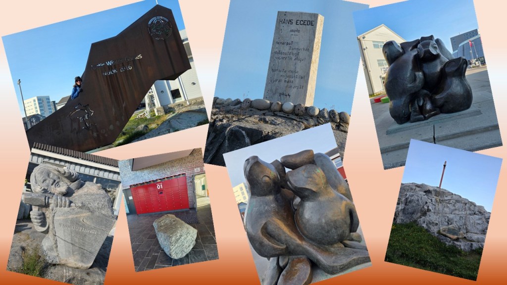 The walk into town takes about 25 minutes, mostly uphill in the beginning, but then leveling out once we are in town. Our route takes us through the main center of the New Town area, down Imaneq, the pedestrian shopping street and past some of the many sculptures and monuments to Hans Egede – yes, the same Norwegian Lutheran Missionary who was all over these parts of the world – as well as a cool statue in front of the gravestone carver, the landmark commemorating Samuel Kleinschmidts, a missionary who wrote about the Greenlandic language and translated the bible to Greenlandic, a bizarre rock and strange wallpaper like paint inside the post office (on the art walk list, don’t ask!), the stone seals (oh so cute) and the monument to the Arctic winter games in front of the Katuaq Cultural Center.