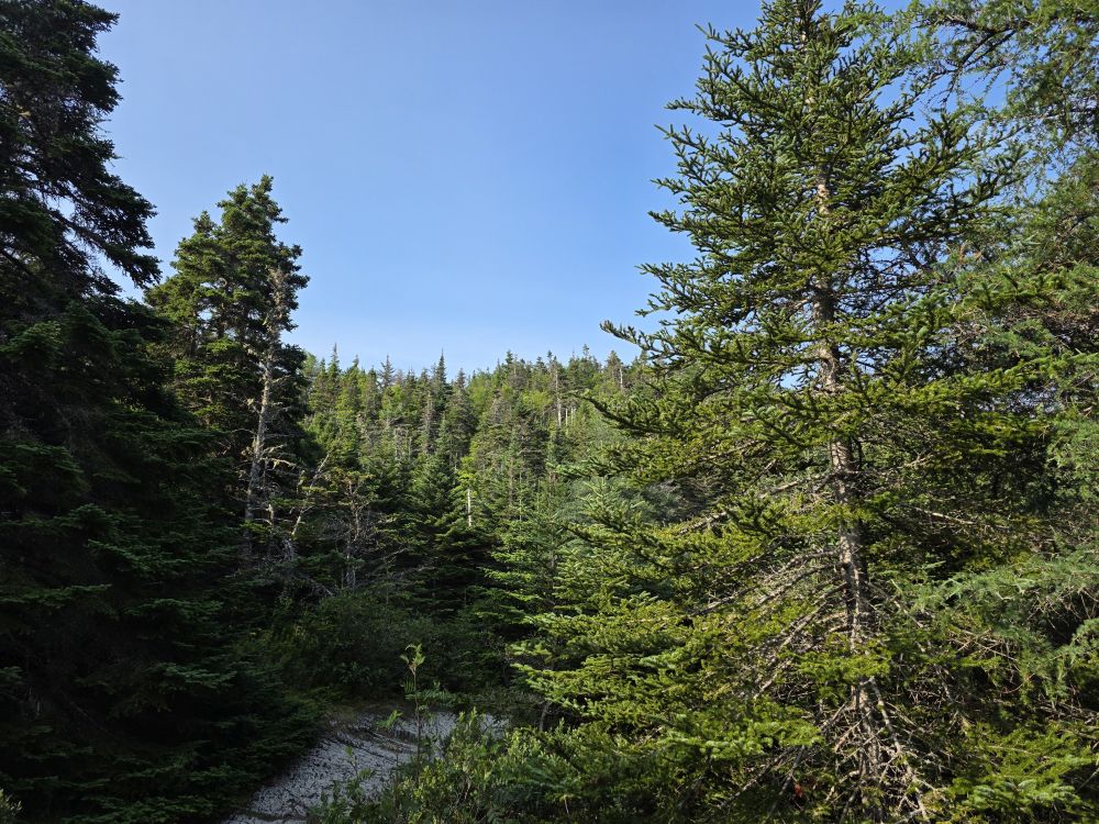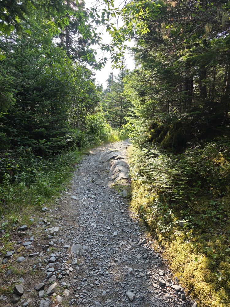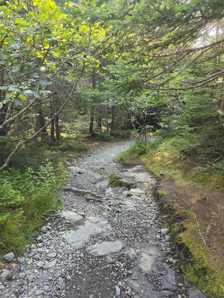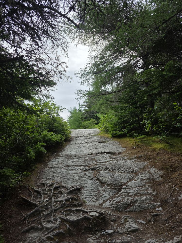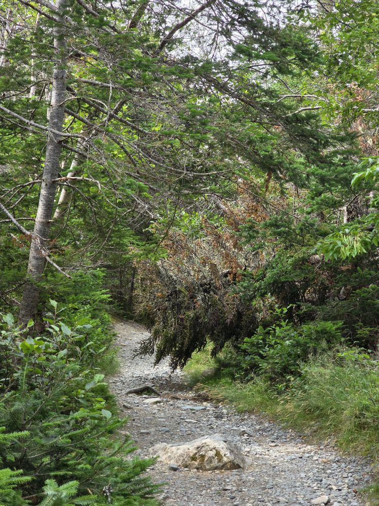 Finding the free parking lot for the trail easily, backing into the space as directed by a bunch of signs posted around the small lot, we strike out on this portion of the East Coast trail, through gorgeous forest, fun train markers, one literally attached to the rock so you don’t go the wrong way – which was easy to do, as we found out in a few minutes when we took a side trail that ended in a little landslide we couldn’t pass. The forest is wonderful, so peaceful and pretty; the rock formations – both on the ground that we scrabble over and towering above us on the cliffs are picturesque as well.