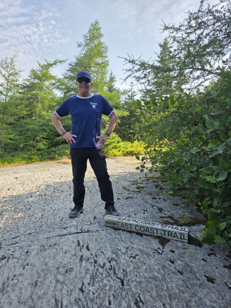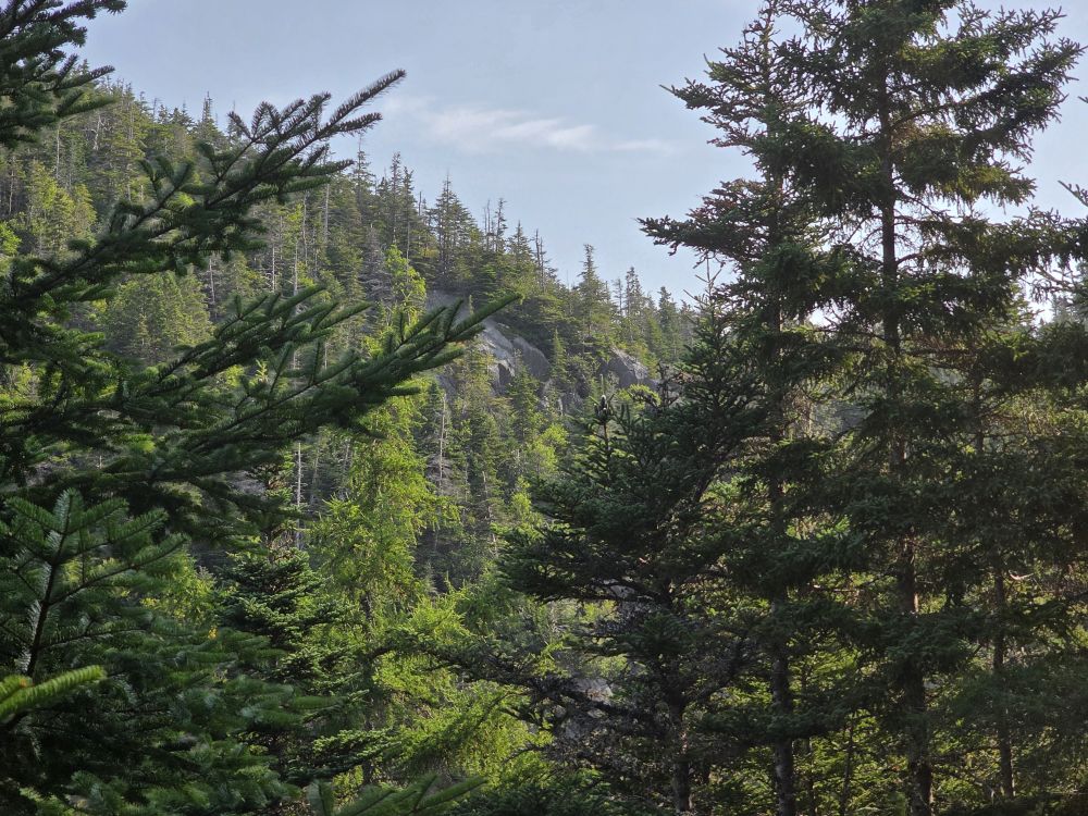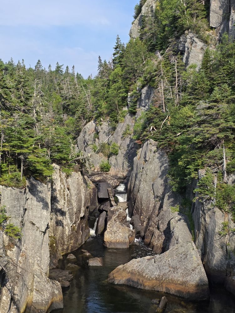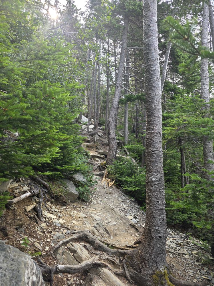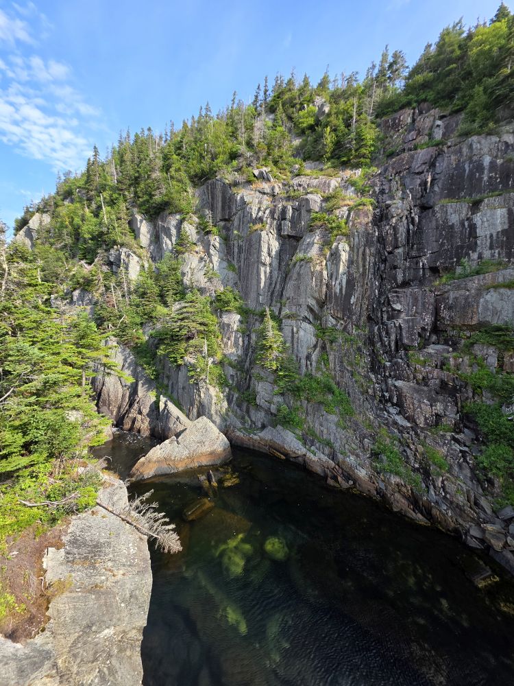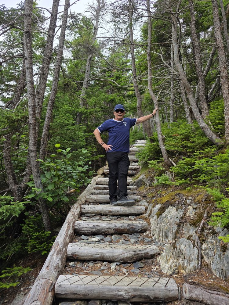 Finding the free parking lot for the trail easily, backing into the space as directed by a bunch of signs posted around the small lot, we strike out on this portion of the East Coast trail, through gorgeous forest, fun train markers, one literally attached to the rock so you don’t go the wrong way – which was easy to do, as we found out in a few minutes when we took a side trail that ended in a little landslide we couldn’t pass. The forest is wonderful, so peaceful and pretty; the rock formations – both on the ground that we scrabble over and towering above us on the cliffs are picturesque as well.