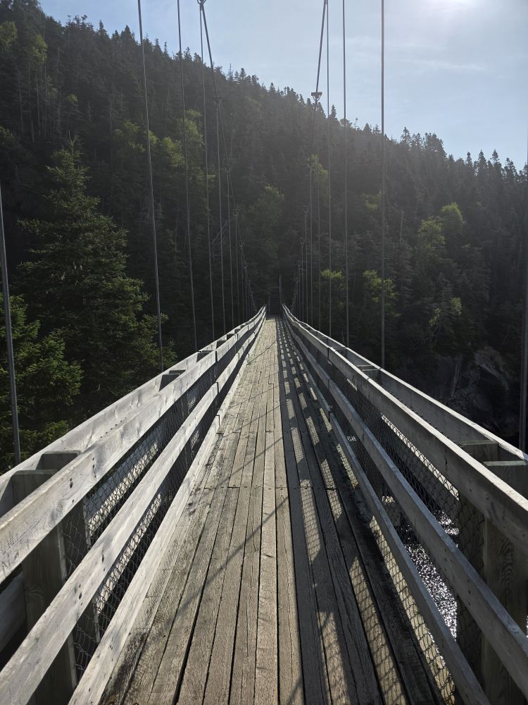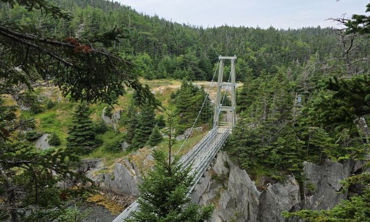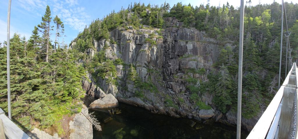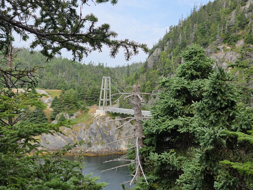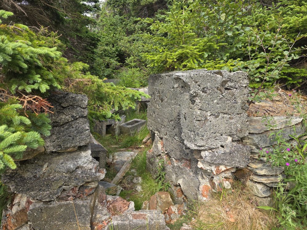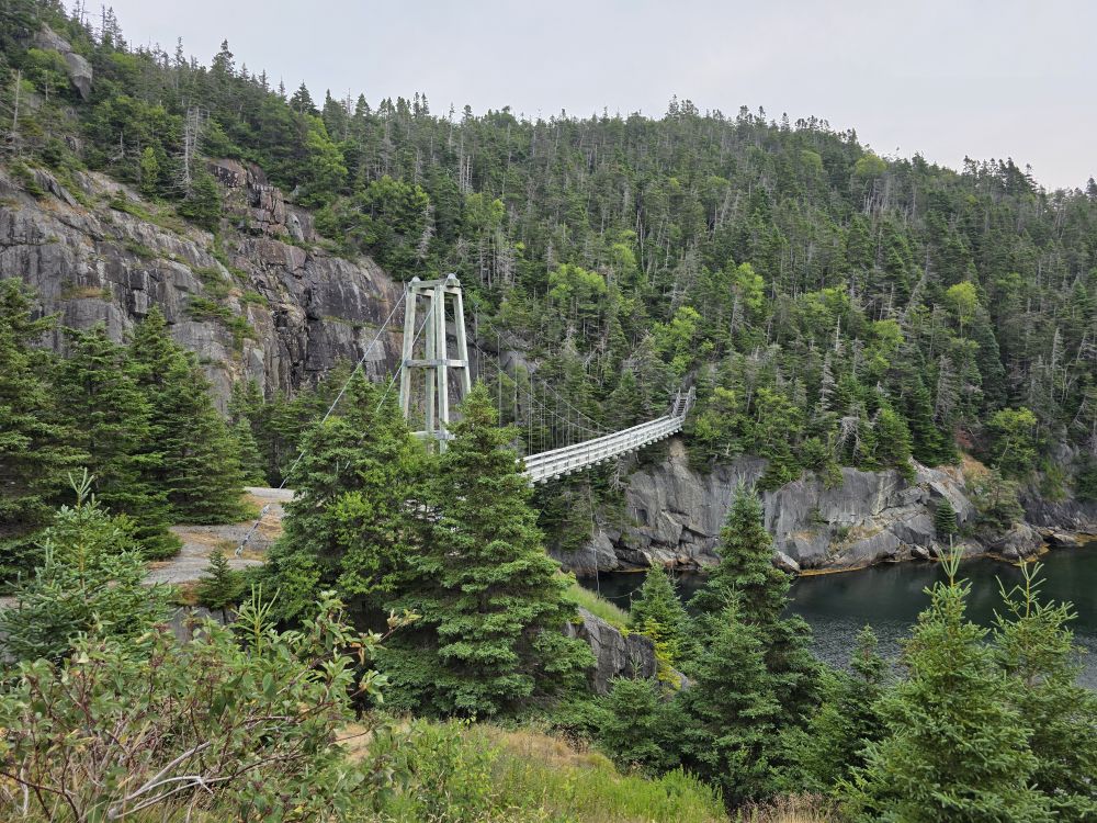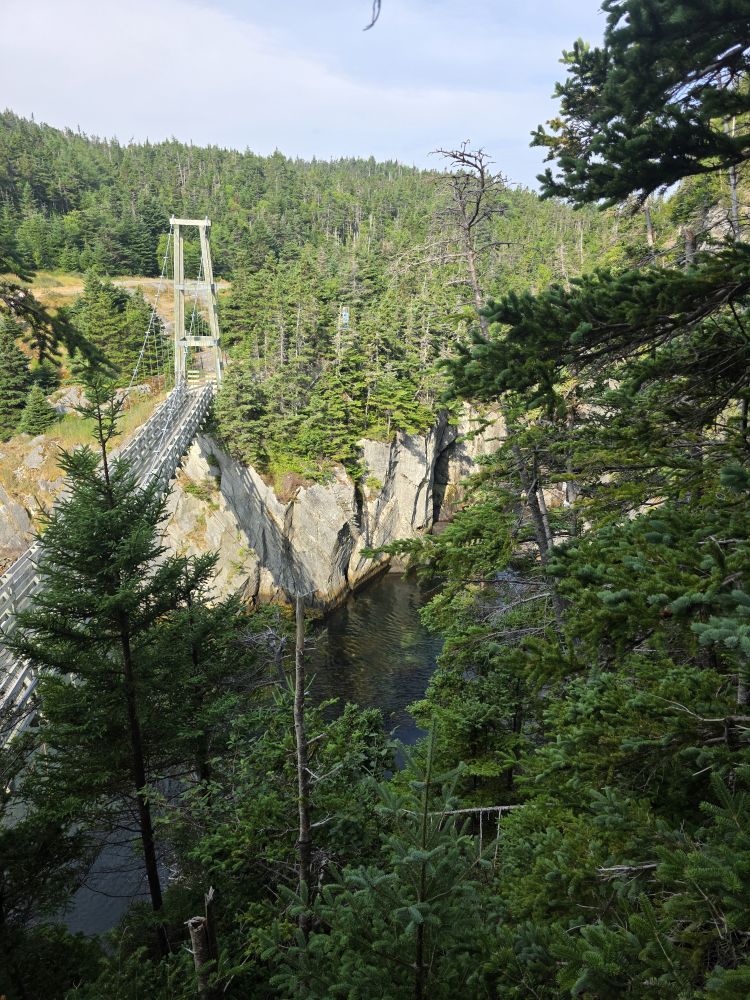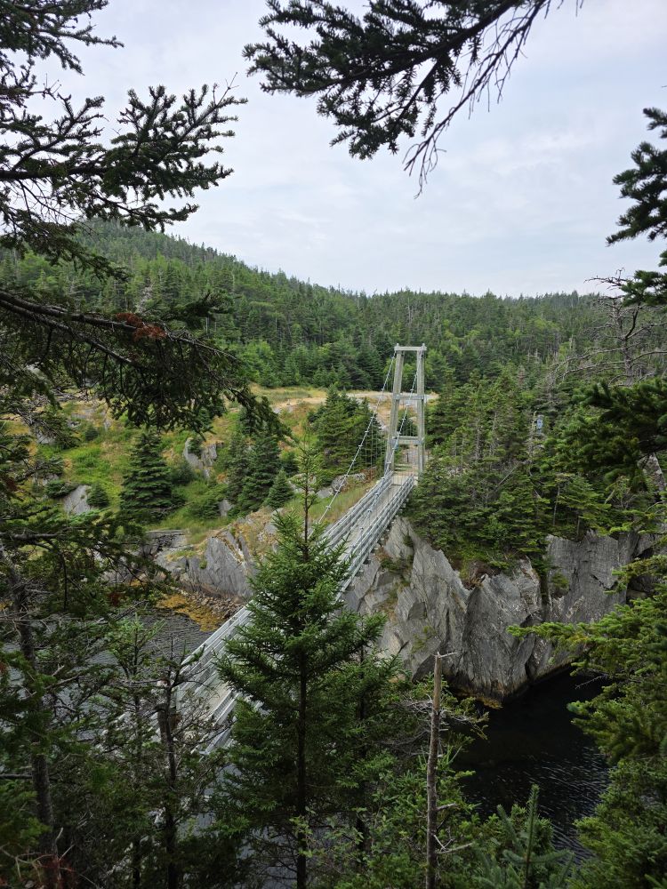 After about 1 mile or so, we begin to pass what remains of the structures of La Manche Village. The Village was first settled in the 1840s by fishermen, growing into a community of about 54 by 1949, complete with a little church, school and suspension bridge to cross the inlet – which looked like a “sleeve,” thus the name, La Manche (sleeve in French). The school closed, and by 1961 the population dwindled to 25 individuals. La Manche was finally totally abandoned in 1966 when a January storm caused waves so large the wharves were demolished and the suspension bridge collapsed. 30 years later, the East Coast Trail Association rebuilt the suspension bridge to connect the park trail system to the larger East Coast Trail.