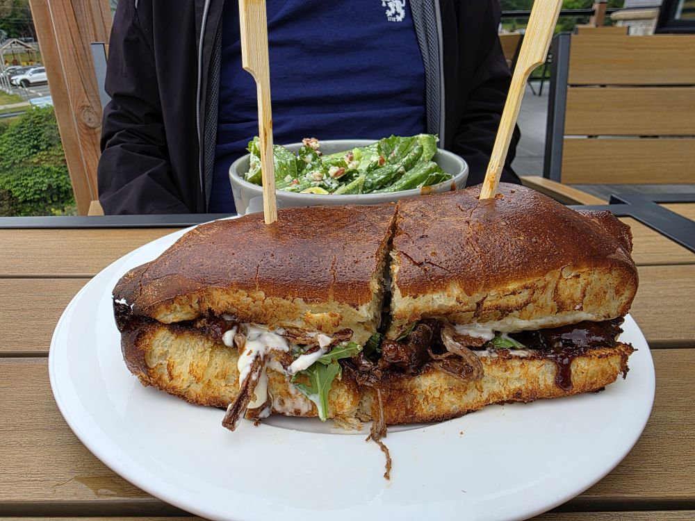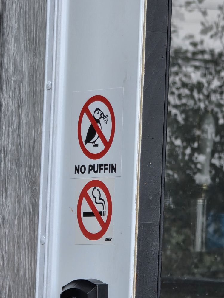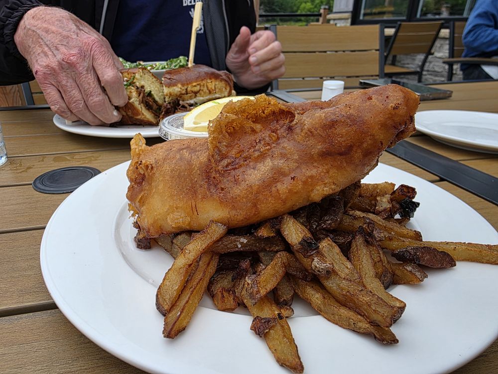 On up the coast we go to Bay Bulls, stopping at the Stone Ducky – just because we loved the name! Oh, and the fact that they opened at 11am. Sitting on the windy deck, overlooking the harbor, we tucked into a feast – massively huge Fried Cod and equally massive Brisket Horseradish Sub, accompanied by an excellent glass of Canadian wine and Iceberg Beer. Love the blue bottle!
