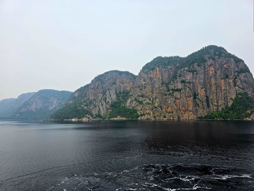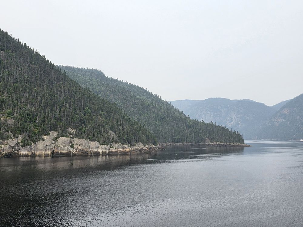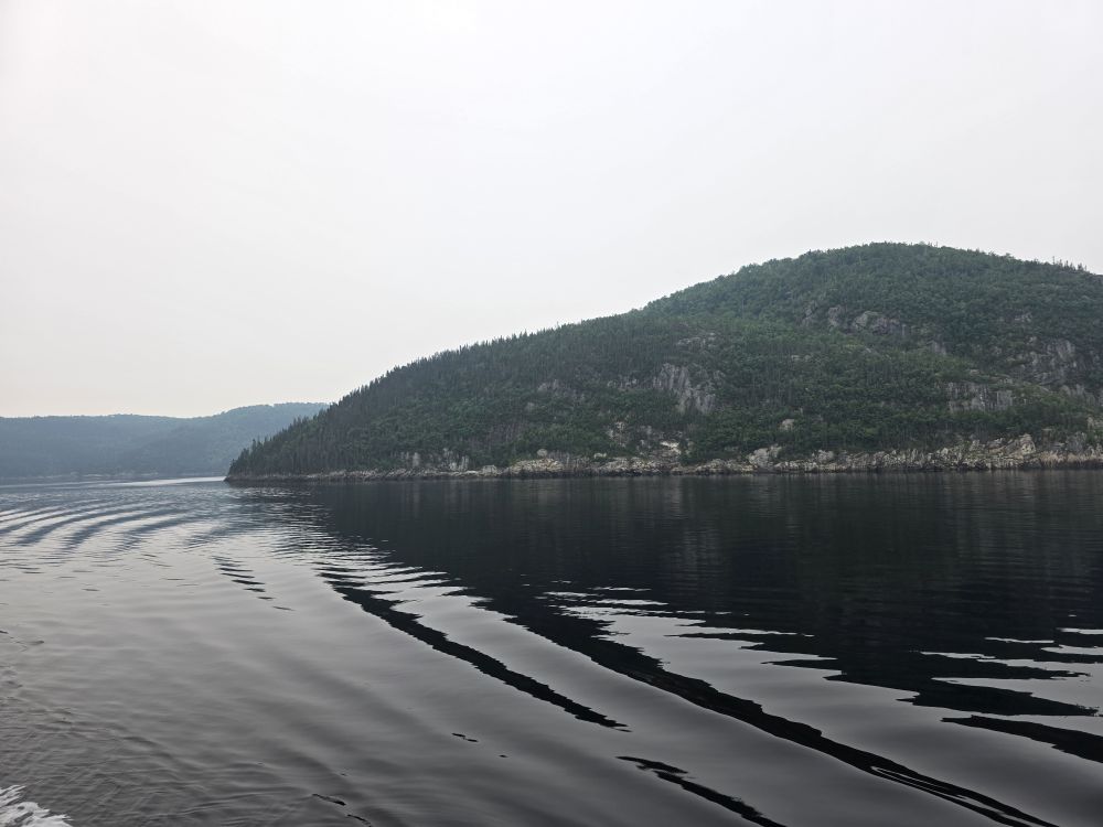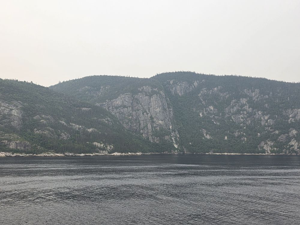 A misty overcast chilly morning greets us on our way into the Saguenay Fjord. Tons of people (as usual) missed the time change – Windows is quite busy for this time of the morning and the gym fills up really fast. We get through our routine quickly, showering and heading up to Mosaics to hang out, with forays out on deck to see the Beluga whales which look more like dolphins swimming down the fjord. (See the little white dot out there in the water? That’s a Beluga. Yeah, well, best we could do, even with our great phone cameras!)