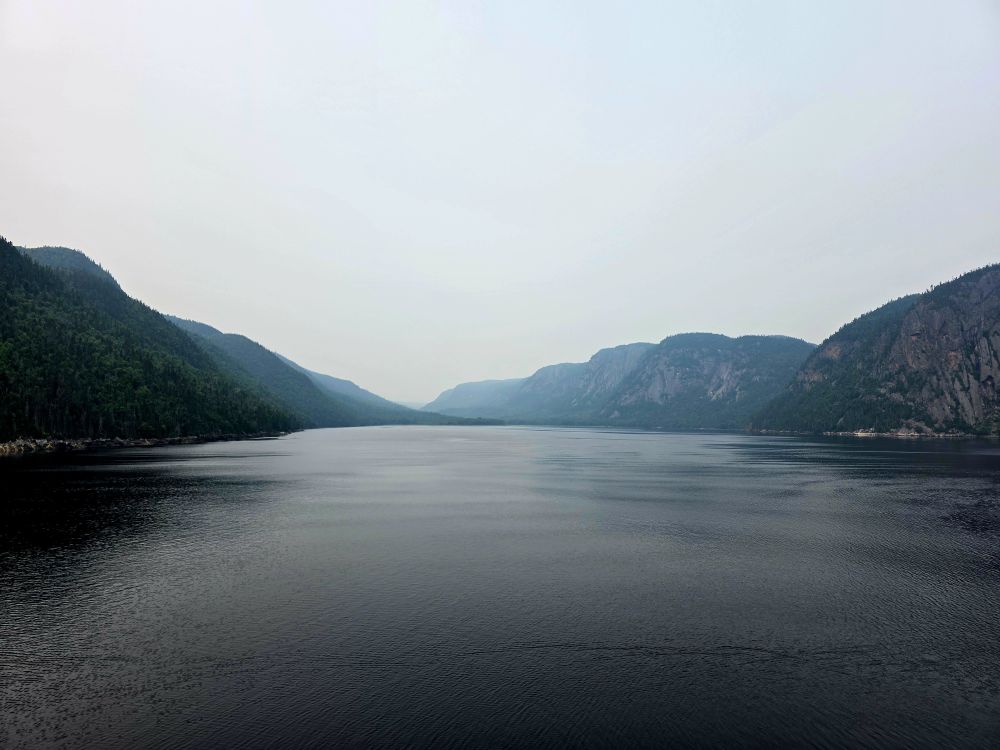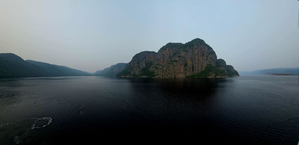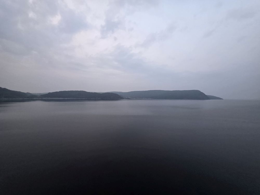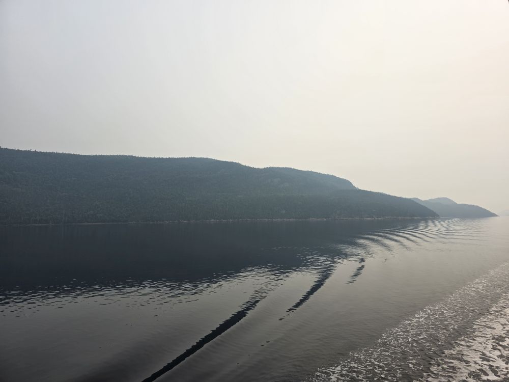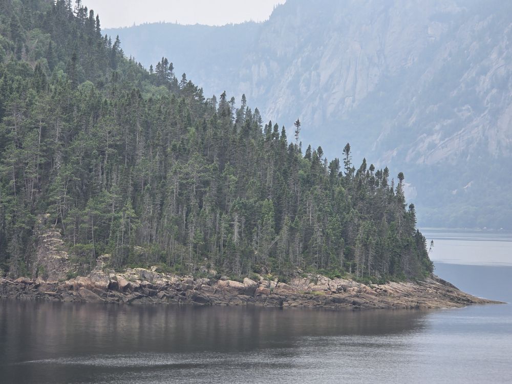A misty overcast chilly morning greets us on our way into the Saguenay Fjord. Tons of people (as usual) missed the time change – Windows is quite busy for this time of the morning and the gym fills up really fast. We get through our routine quickly, showering and heading up to Mosaics to hang out, with forays out on deck to see the Beluga whales which look more like dolphins swimming down the fjord. (See the little white dot out there in the water? That’s a Beluga. Yeah, well, best we could do, even with our great phone cameras!)