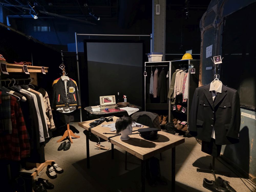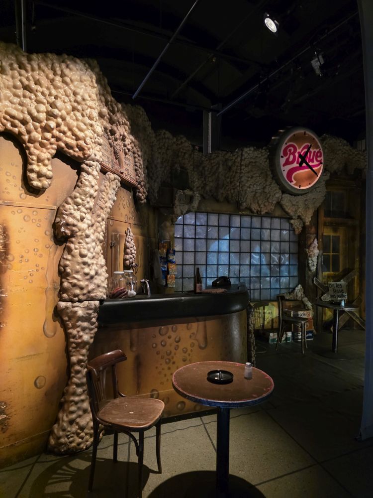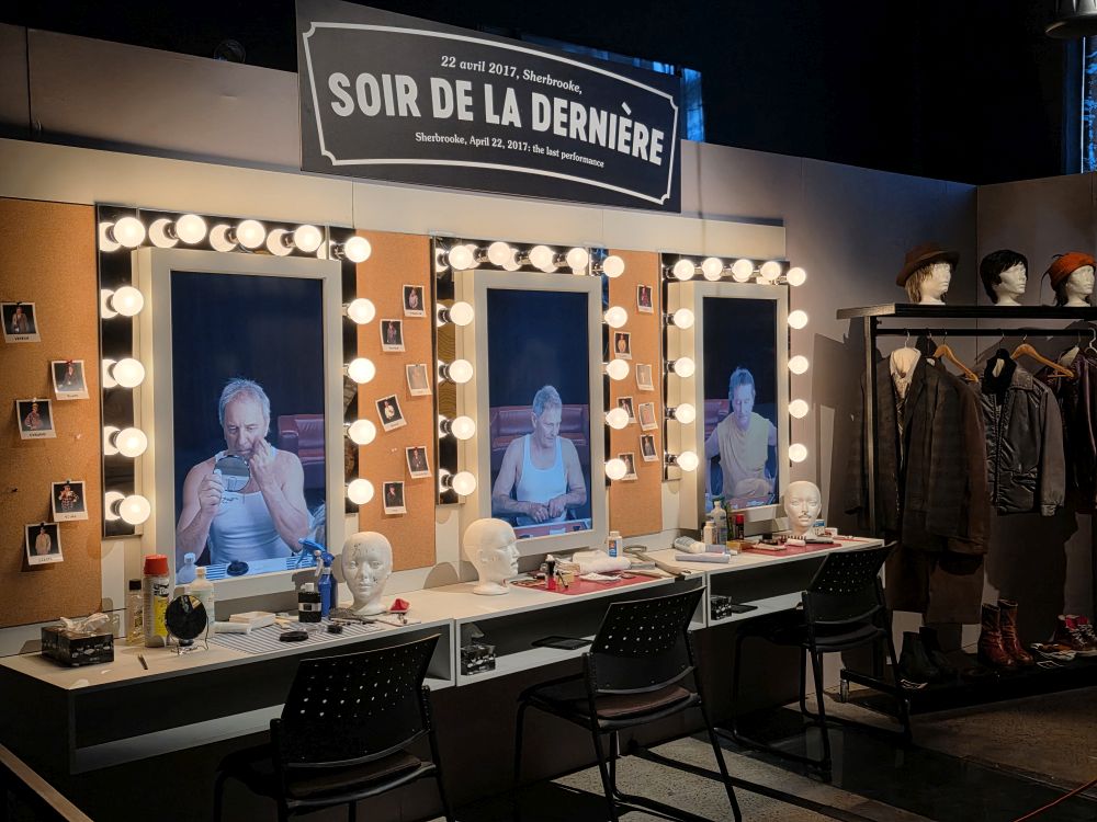 Starting in the Broue room – we watch a video of the play, all in French which none of our apps could translate for us – learning about the characters by motions and expressions. It looks like a hysterically funny adaptation of a tavern and the people who are loyal clients – played by just 3 actors in 18 roles. After a few minutes of watching, we wander through the exhibit where there are scripts with side notes, posters and pictures, and the full set! Full-sized, everything, from backstage to props to wardrobe to a cool multi-media (French only) dressing room set up where each actor talks at you from their mirror from their last performance in 2017. Concise overviews throughout the exhibit explain that the play started in an 80-seat theater in 1979 and grew to be the greatest success story in the history of Quebec theater, even being performed at one time in the Port Royal Theater in Montreal. It became a must-see show, presented 3,322 times and seen by over 3 million people.