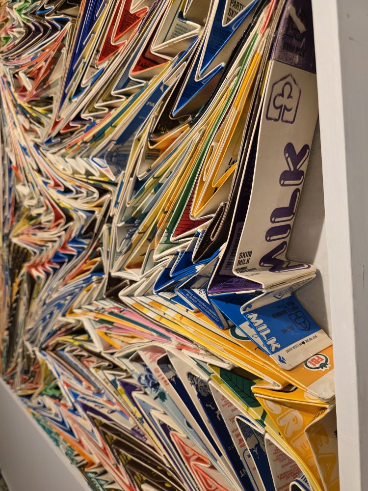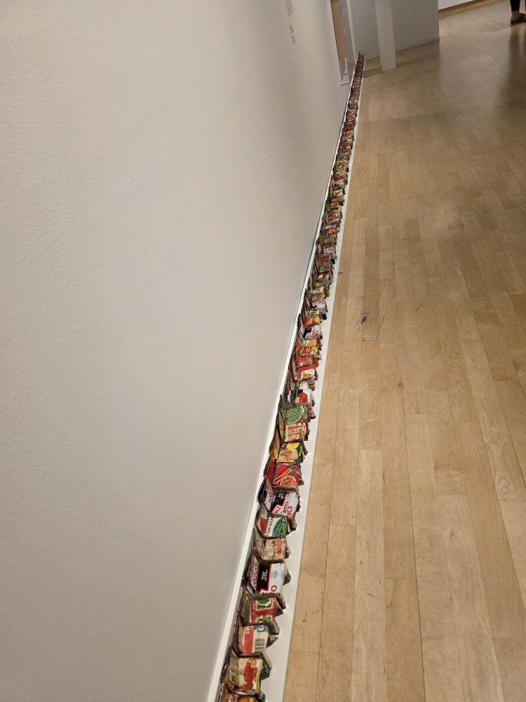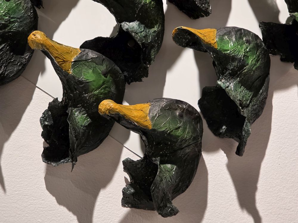 The Jean-Jules exhibit is basically another recycler gone wild! He used different materials – milk cartons, tin cans, and the like – to create very imaginative art. Thousands of small chairs placed around the perimeter of the room and in the center in something called “circumference,” 60,000 milk cartons pressed into a piece called “Rug Under Pressure.” It just goes on. He created 2100 duck heads from tinfoil, then painted and plastered them – called Duck Flight – then invited the public to steal them to inspire reflection on the role museums play in conserving artwork and the public’s own role in preserving nature.