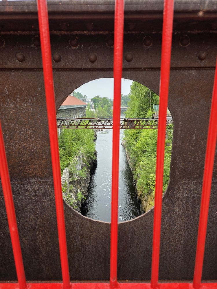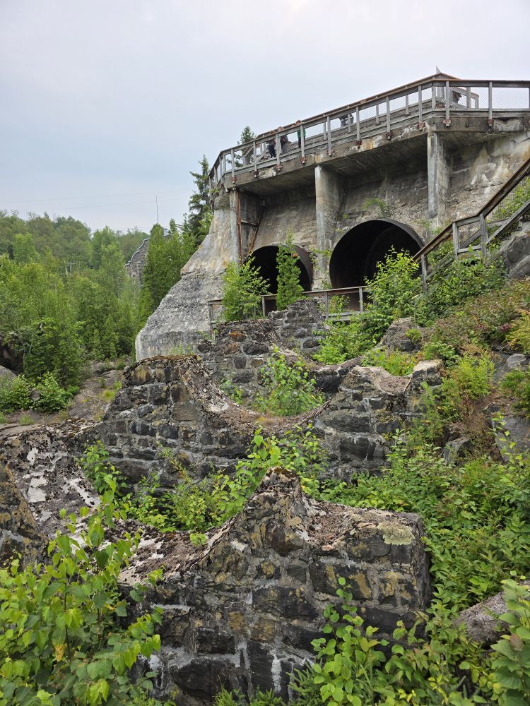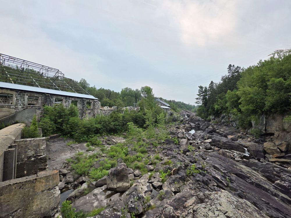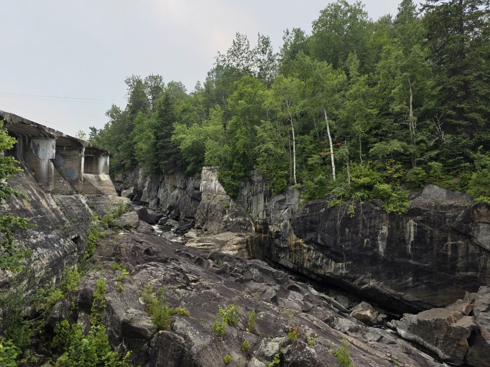 From here, we were able to go outside and wander through the old Pulperie factory grounds. Winding our way up and around all the remains of the old buildings – which ceased operations in 1930 and then were damaged in the 1996 Saguenay flood. Even though it is ruins, and just a pulp and paper factory, the contrast between the green foliage, the black Saguenay stream rocks and the multi-colored stones used to build the factory still make for a really pretty and nice stroll through the grounds. On our way out, we pass by the memorial to the former workers of the pulp factory – created from a remnant of the concrete retaining wall of the old factory. And then we are off to the Flood museum, just down the road.