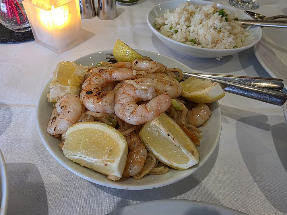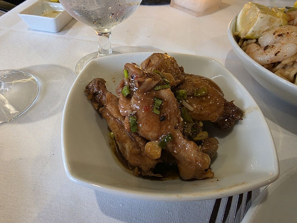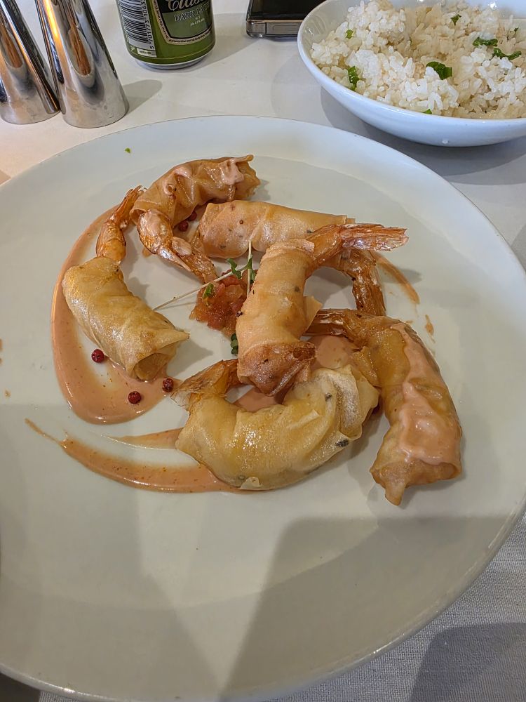 Onto dinner (after a shower and change of clothes) where Vicson looks at us with his sweet sad eyes and says, “Mr. and Mr. Stevens, we have a problem.” Yep – TSA, although another set of TSA – who obviously have decided they want our table. This is getting old. Never fear though, Vicson is here. He sets us up in a 4 top for only the 2 of us in Joel’s section – which actually works better due to the feast that is set before us! So much food, all so, so good. The chef’s have gone above and beyond with this – as well as Charles who chose the menu for us! – garlic rice, shrimp Pancit, Chicken Adobo and whole fried shrimp in spring roll wrappers (not necessarily Filipino, but so good all the same). It was a true feast with Joel and Charles and Ryan all over to serve us and make sure everything was working as it should.