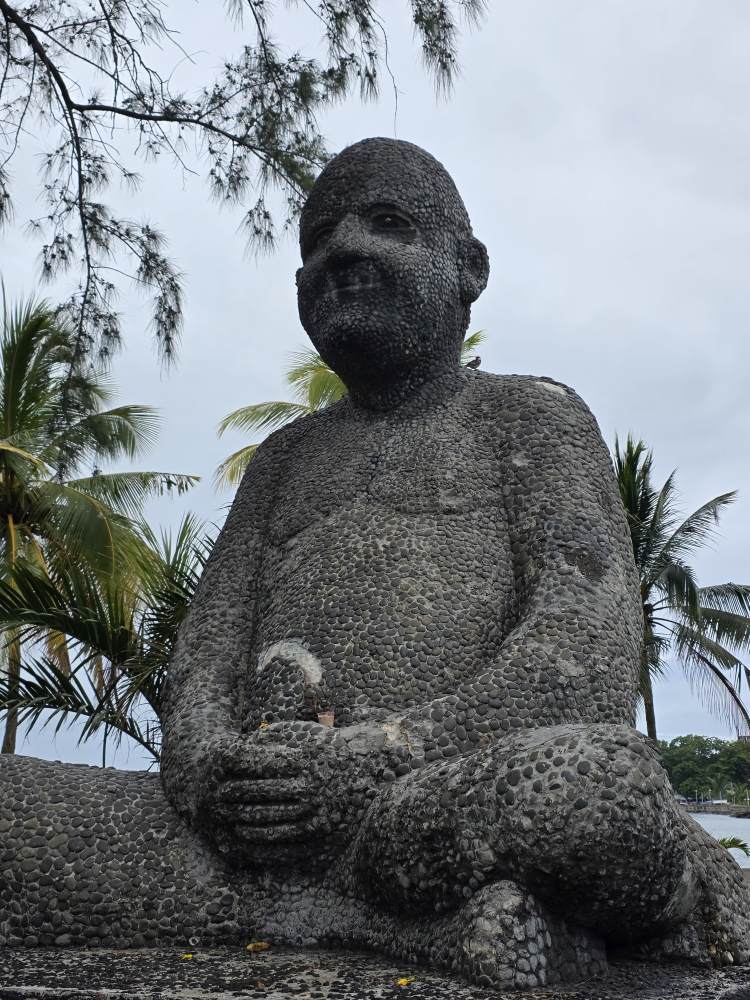 At the waterfront park, we turn back toward the apartment, since we visited here in 2020 and don’t need to walk out to the monument for carved depiction of the 1810 battle. Walking this way, we pass the statue of Swami Sivananda, or the Gros Boudha. Sivananda was a doctor in Malaysia who devoted himself to the service of the needy – apparently there are numerous places in Mauritius named after him, although we’re not really sure why, except that he was an extraordinary person who believed deeply in spirituality. At any rate, the statue does remind you of a Buddha statue, just with different features, all created from stone and pebbles.