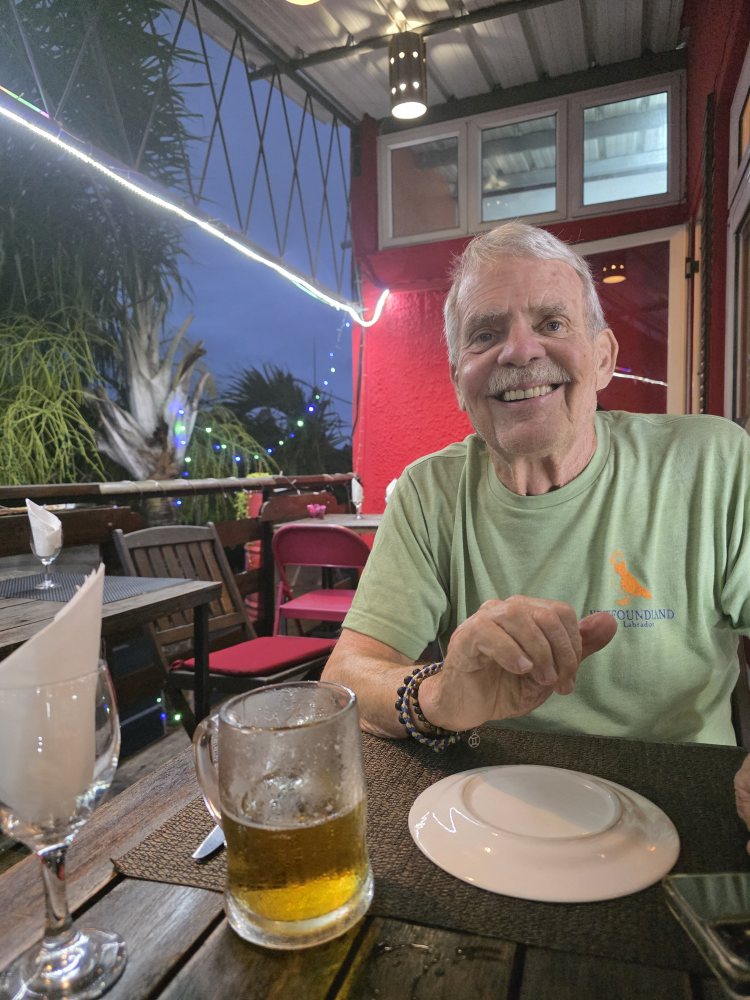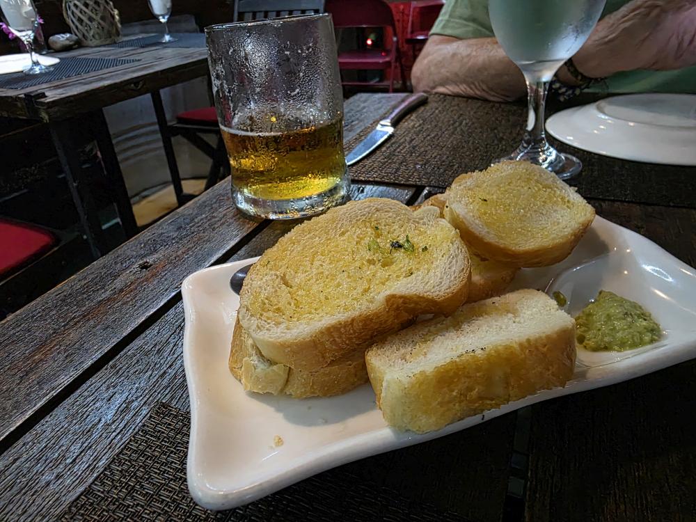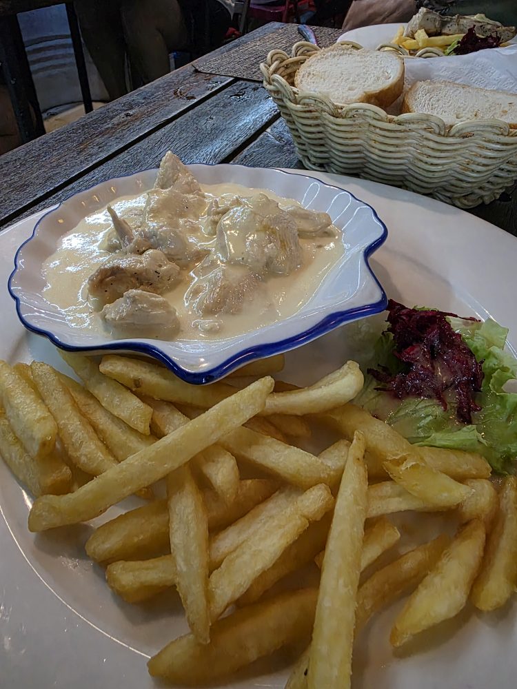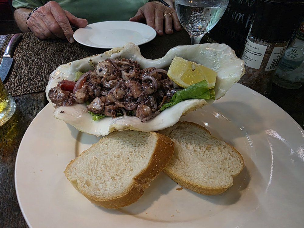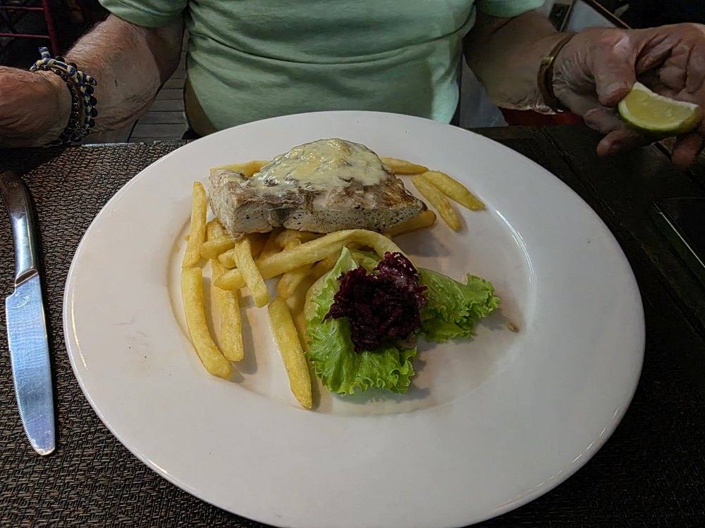 Seven o’clock rolls around, and we head over to Le Bistrot for our booking…which we of course did not need because we are the very first customers there, grabbing the primo 2-top outside on the corner near the windows so we can catch the breeze, but not get wet if it rains. Perfect. And the meal matches the seating. Oh so good and delicious. Garlic bread is brought to the table, then we have a “starter” of Octopus salad – all octopus in a red vinaigrette – and huge. I’m full from the bread and my little portion of the octopus. For our mains, I had the Vanilla Chicken. I’ve been waiting for that ever since we booked the apartment and looked at restaurants in the area – and it does not disappoint. Tender chunks of chicken in this delicious vanilla cream sauce. Absolutely fabulous. And the sweet waitress/hostess brought us fresh bread to sop up the sauce. Perfection. Ed had the grilled Dorado, again, fabulous. Good size, perfectly grilled, a light sauce on top. All in all, an excellent meal and well worth the wait (even the additional day wait, as we learned they were open last night. Sigh. But our waitress said they were really busy, so tonight worked much better for us – who knows where we would have sat, or if the meals would have been as good.)