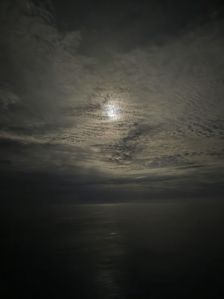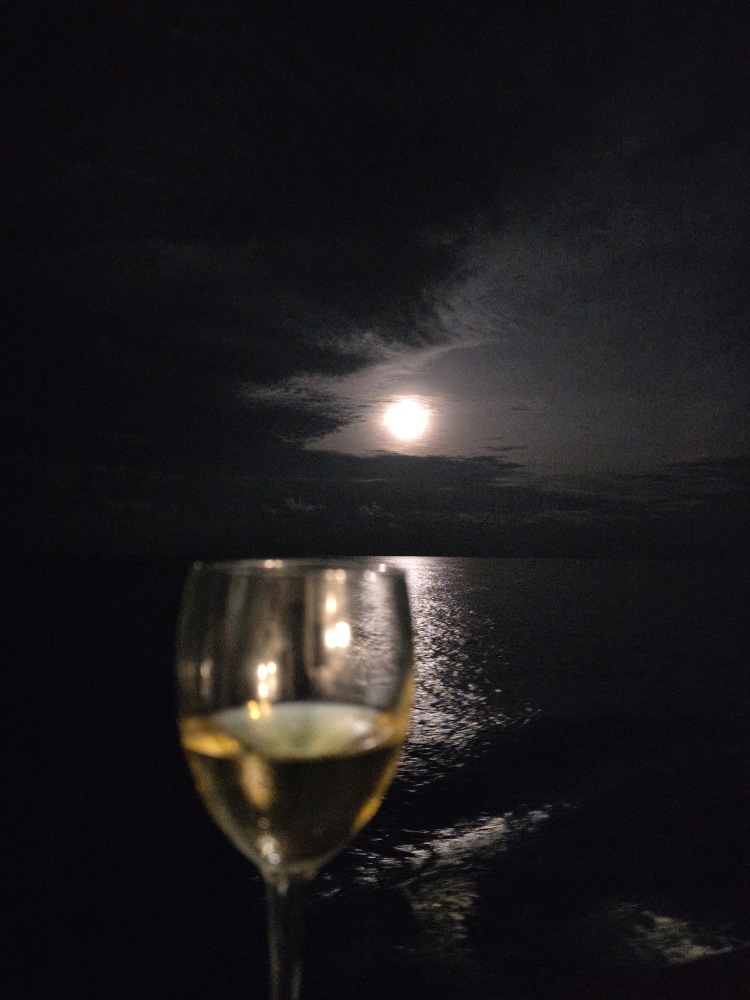 And our afternoon is complete! Gym, dinner at table #2 with Joel then music with Harmony Hive. Tonight is the Captain’s Welcome and then a violinist which we eschew in lieu of sitting on the balcony in the gorgeous full moon, relaxing and reading until it’s time to turn in.