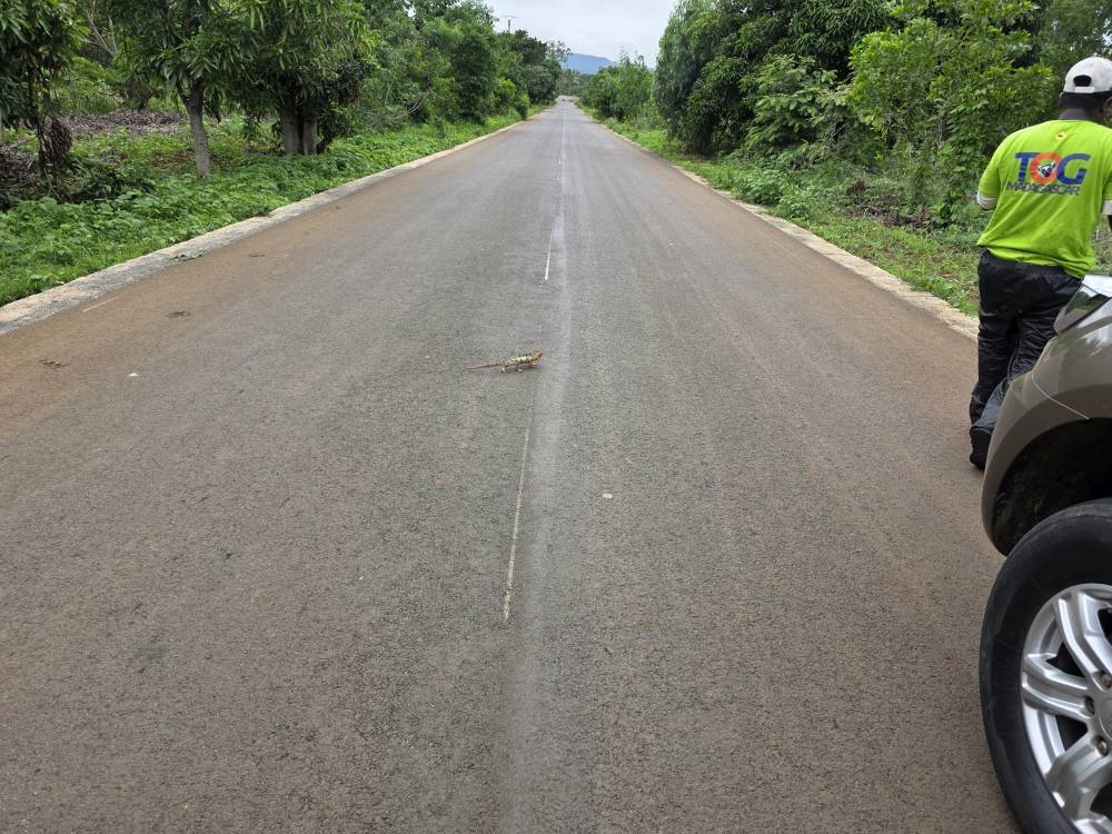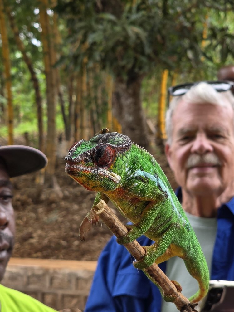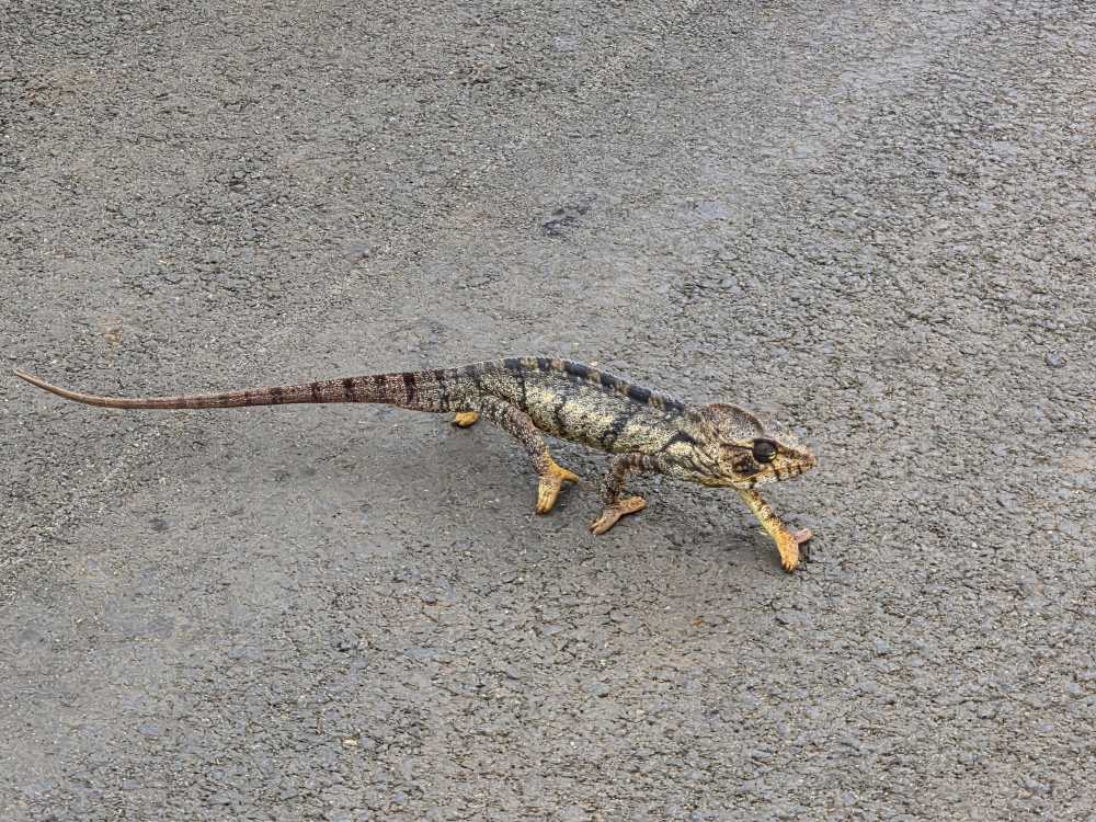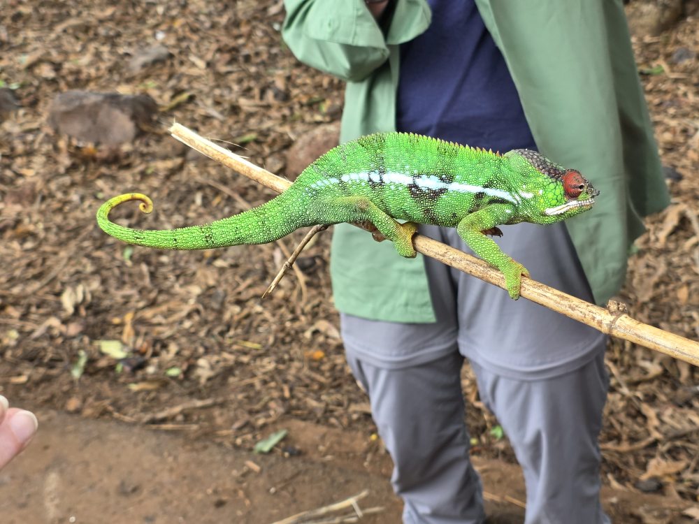 Back in the car, we’re off again – now with the challenge mounted: Flo has to find a chameleon. Game on. And find one he does – a vibrantly green Panther Chameleon out in the bushes on the side of the road. We’re out of the car again, admiring this gorgeous guy on Flo’s stick. Just look at his eyes. And those white scales around his mouth. He looks like a skeleton head or something. So incredible.