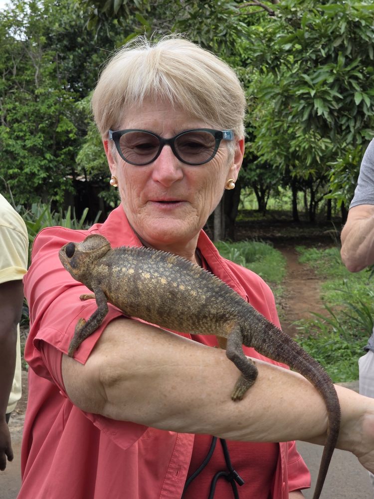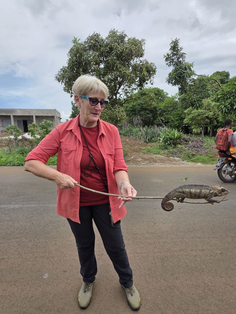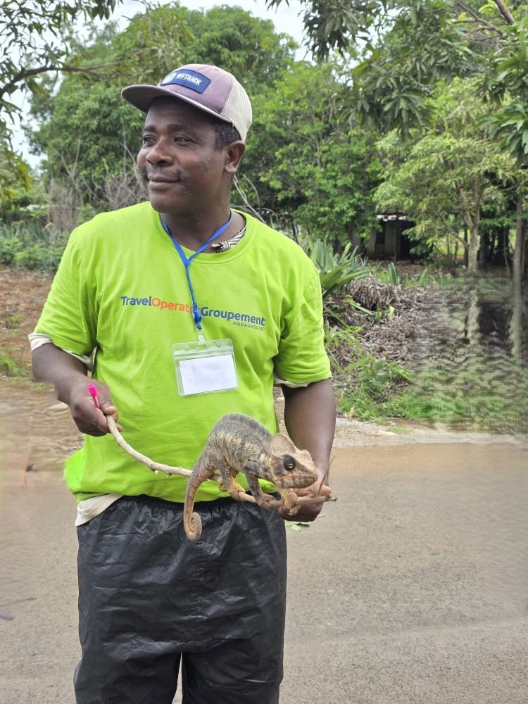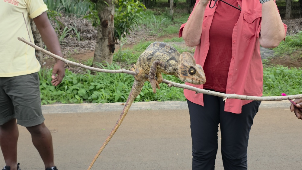 A little ways further down the road, Hussain slams on the brakes shouting Chameleon! Son of a gun, there is a huge Oustalet chameleon, otherwise known as the Malagasy Giant Chameleon, right in the middle of the road. Good eyes! We all pile out of the car, following the poor little guy across the road before another vehicle arrives and Flo picks him up with a long stick so we can all get an up close and personal view. Linda even gets to hold the stick and walk with the big guy himself and have him on her arm for a bit. Flo then picks him up and deposits him on one of the women, where it climbs up her arm onto her face. Eek! Otherwise – totally cool.