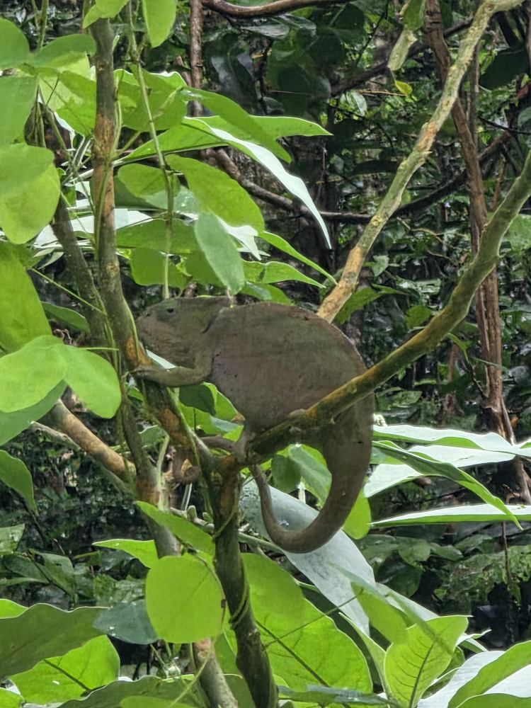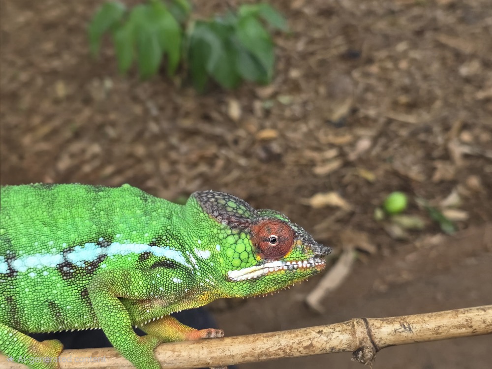 Yay. Lemurs! Taking our leave, we find yet another chameleon species: The Calumma Amber Chameleon. Perched in the crook of a tree, blending in with his greenish tannish body as a chameleon is wont to do. Further on Flo also spots a Calumma Lumotin Blue Nose Chameleon – look at that little blue nose.