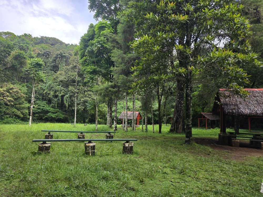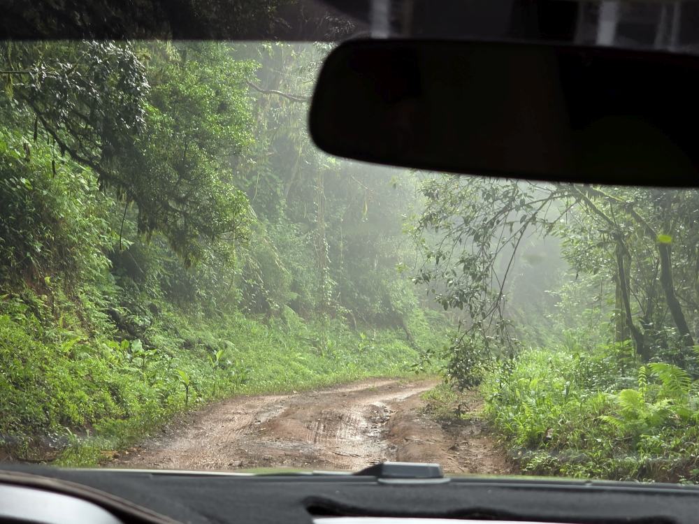 Navigating the muddy, water filled and slippery path, we make it to the waterfall for a few pictures just as the rain starts to pour in. Time to abort! Of course, it is a rainforest, in the rainy season, so what else can you expect? We’re prepared.