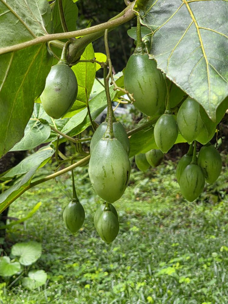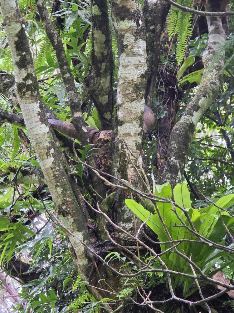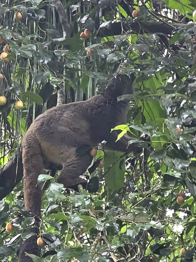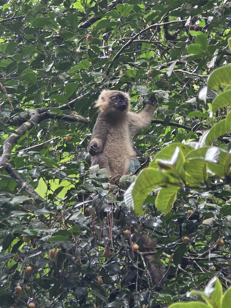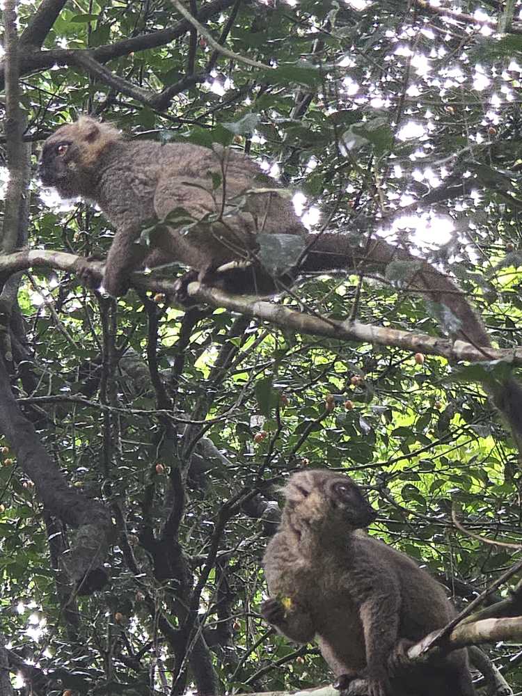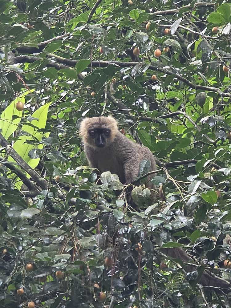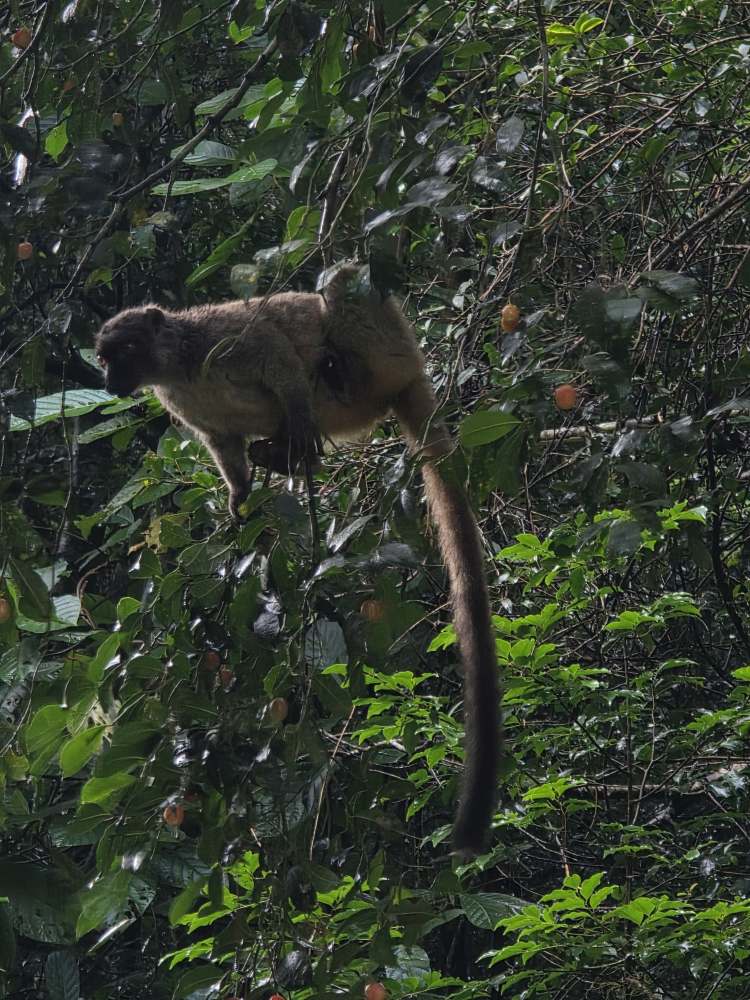 Snack and chameleon done, we head toward the waterfall, passing a tomato tree. Yes, that is what I said (well what Flo said) a tomato tree! Too bad they aren’t ripe, we’d love to try those. As we are heading toward the waterfall path, what do we spy but a whole horde of Sanford’s Brown Lemurs. Yay! The males are the ones with the black head and white hair around its face. The brown faced ones are the females. They are all out there eating berries off the tree. Hopping around, looking at us – those eyes! – and then grabbing berries and stuffing their faces.