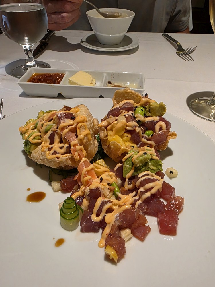 Quickly showering, we manage to make it to dinner virtually at our normal time and are treated with a fabulously presented gyoza appetizer and….poke! A lot of poke! Far better than on Quest. Whether it is the chef (although Shiju is gone now) or just the ship or what, we don’t know, but we are not complaining!