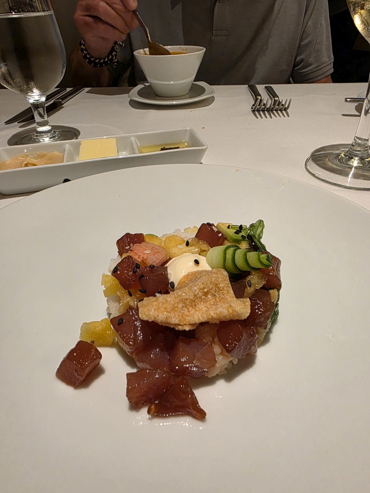 …and onto the rest of our evening: dinner – yay! big portion of Poke! – and the Living Room for Harmony Hive where Abby sang an Adele song for me. They are so good and tight – and Abby has the pipes for Adele, that’s for sure! Aldin is back, looking for the wine as I tell him where Marvin has hidden it, and then we have this big discussion about no more Chenin Blanc – but the dining room has it????? Putu, our bartender friend, is in the Wine Cellar this cruise, so we jokingly tell Aldin to call Putu, or call Nathan, our lead bartender friend, and tell them to rustle up all the Chenin Blanc for me! Little do we know, Aldin actually did call Putu to put the word out! These guys are just too great to us.