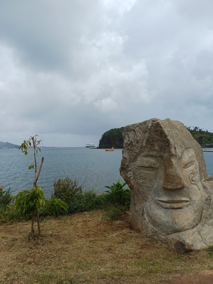 Thus, decision made, we turned around, went back to the pier, wandered through their very well managed market (didn’t buy a thing) and came back to the ship. Didn’t even see the cool stone carving and I Love Mamoudzou sign on the water behind the market. But we do have photos of the stone, courtesy of Audrey (Harmony Hive) who did find the darn thing and took great photos (thank you for sharing)!