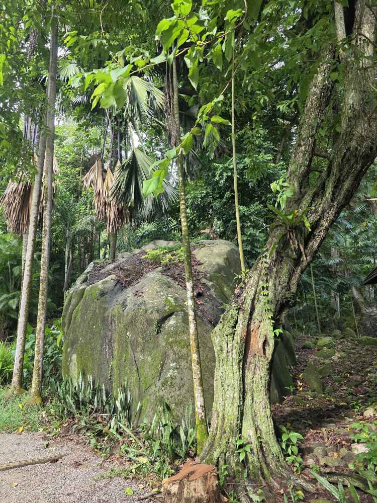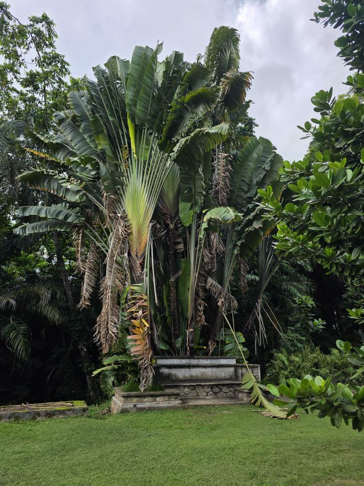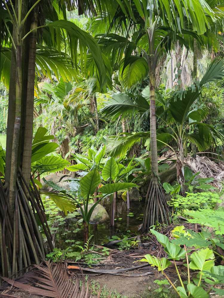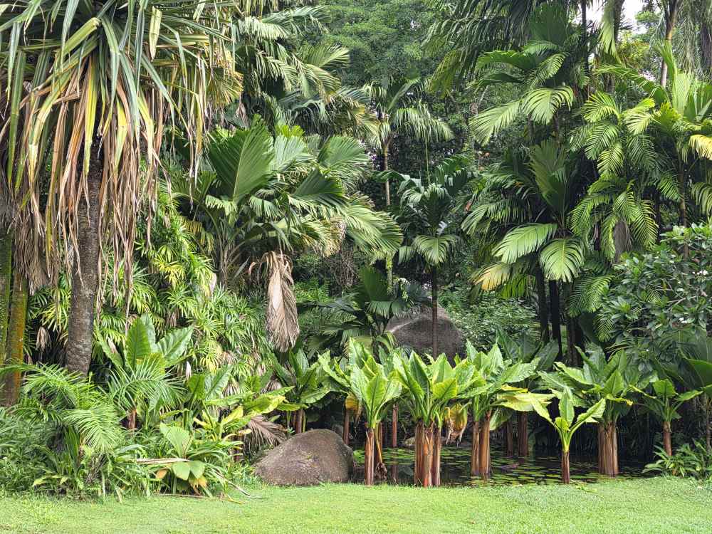 On the main path, we pass the front of the lily ponds, which are quite extensive and beautiful. You’d never know it from the rear path. And further down a Coco de Mer tree with seeds/nuts still on the tree. Those things are massive! Can’t even imagine being anywhere near when they fall.