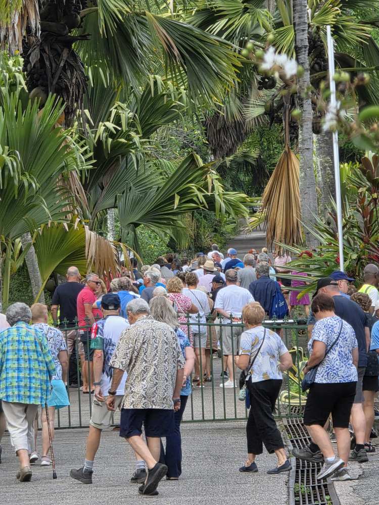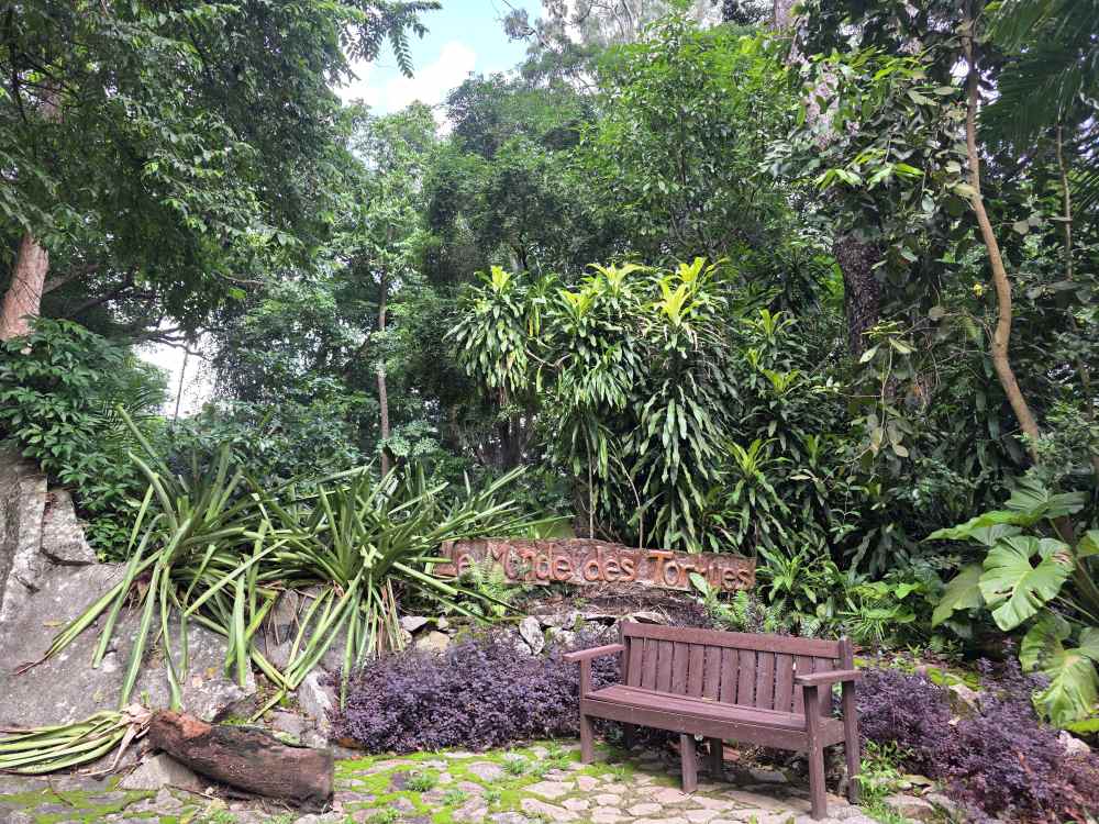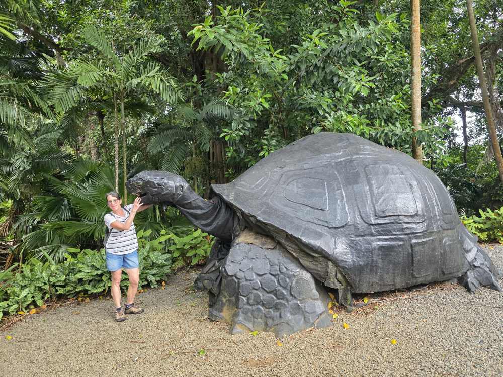 What ensues is a fabulous 45 minutes or so of pure solitary bliss inside this gorgeous botanical garden. There is no one around – no one. Even though there are garden vehicles, there are no people whatsoever. We pass a monument to a former Director of Agriculture and an Entomologist, then continue on to the Aldabra Giant Tortoise area. OMG! 26 massive Tortoise all either lumbering around or eating. Totally wild and amazing – look at them all lined up like organized helmets in a row!