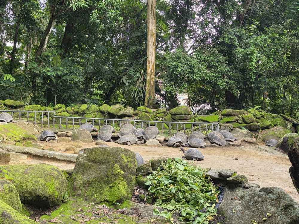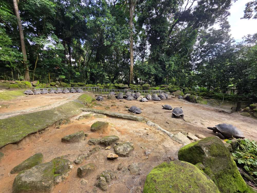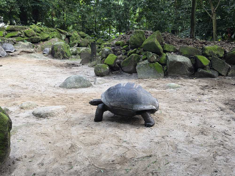 There are great informational posters in the enclosure too – telling us all about the tortoises; they live to a ripe old age of 250 years! Aldabra are one of the last 2 existing species, originating from a remote atoll of the Seychelles of the same name, they have the ability to survive almost 3 months without food or water. Unlike other tortoises on the mainland that have predators and retract their heads and legs into their shells, Aldabra Tortoises have no predators on the Atoll and sleep with their heads and legs relaxed and extended.