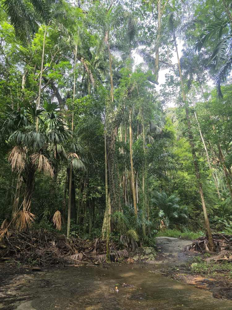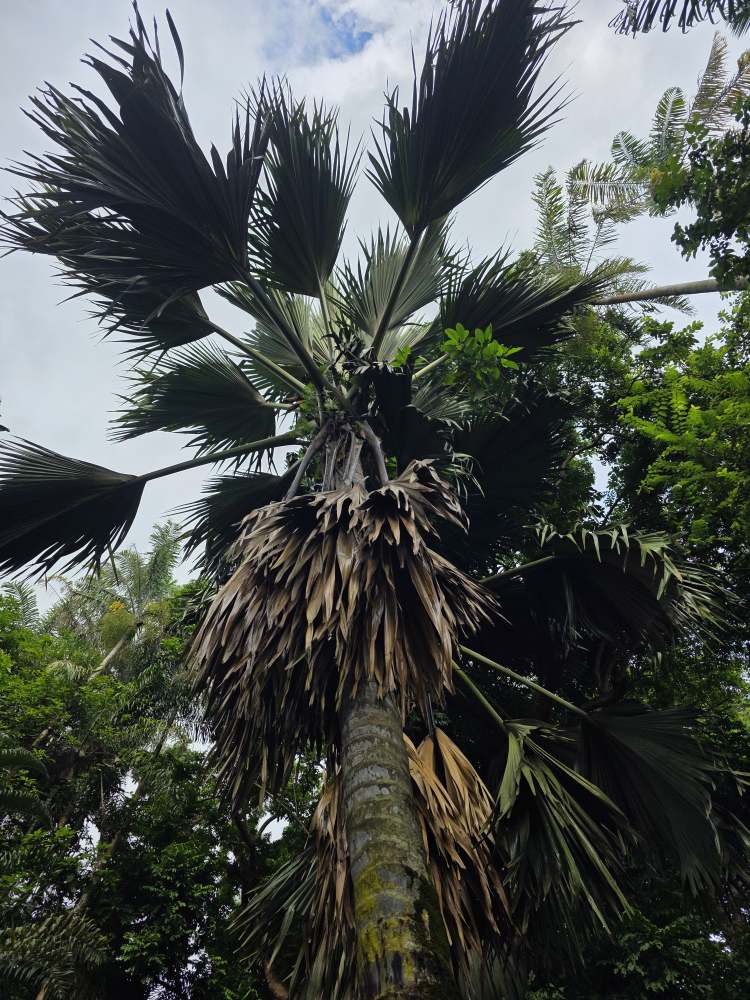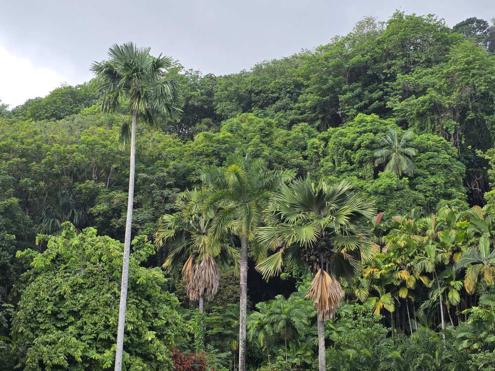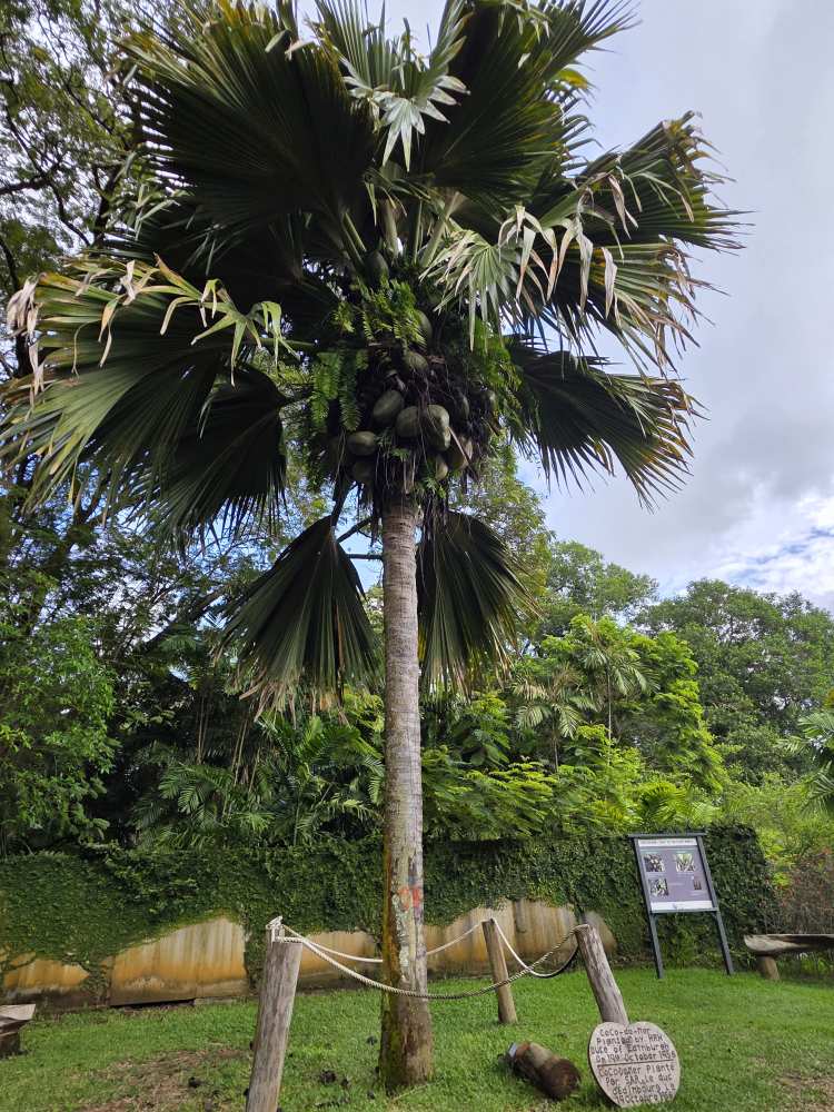 Taking a trail that wraps around the edges of the park, we pass a grove of Coco de Mer trees with their massive coconut-like seeds/nuts, the largest seeds/nuts in the world, weighing up to 40 pounds.