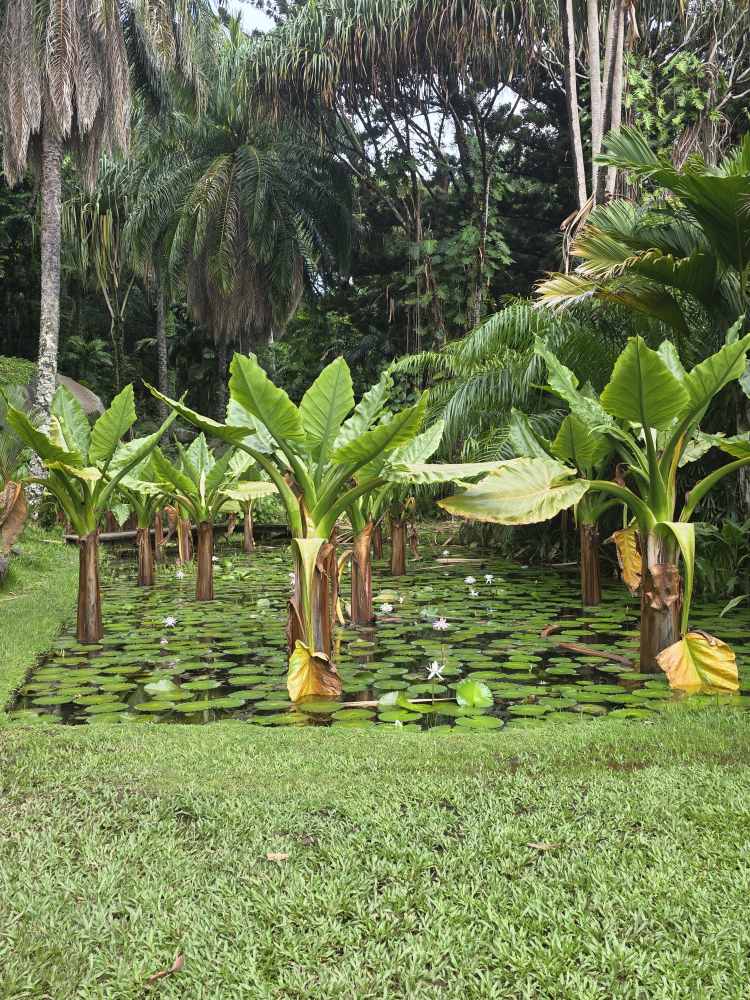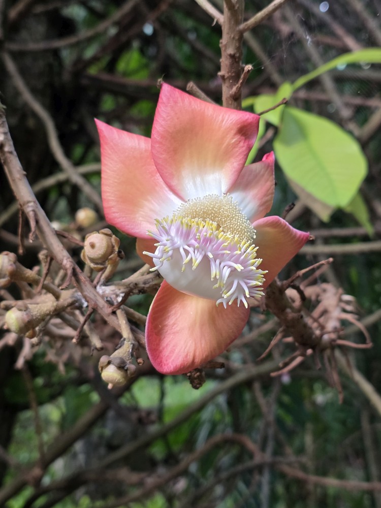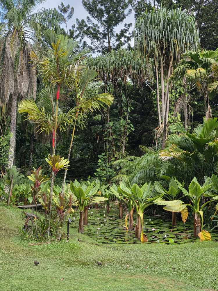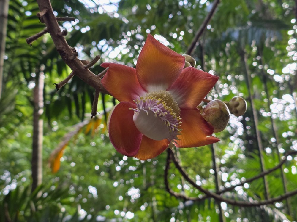 We pass the back of a lily pond with exposed root trees, a cannonball tree with the prettiest blossoms.