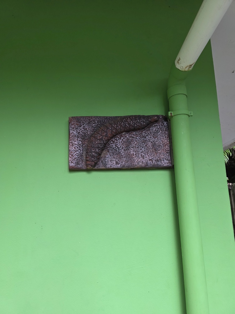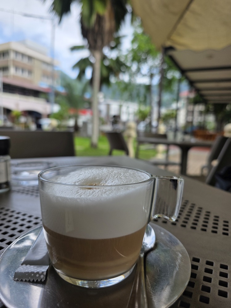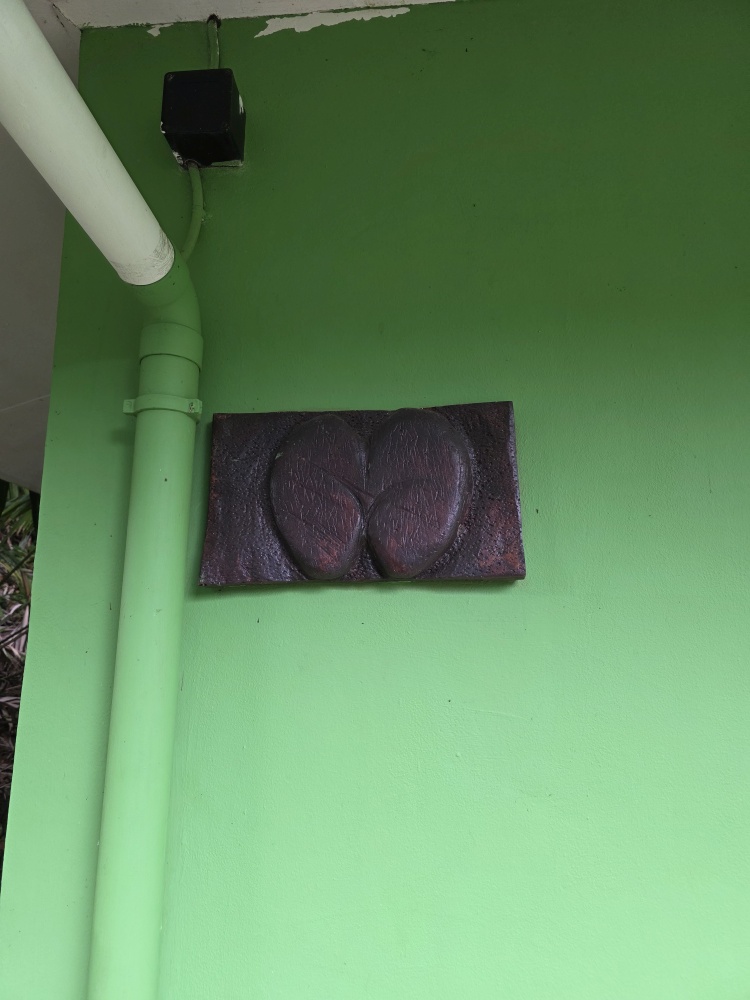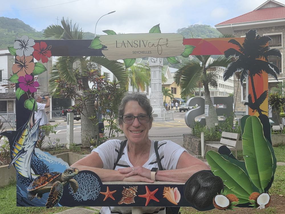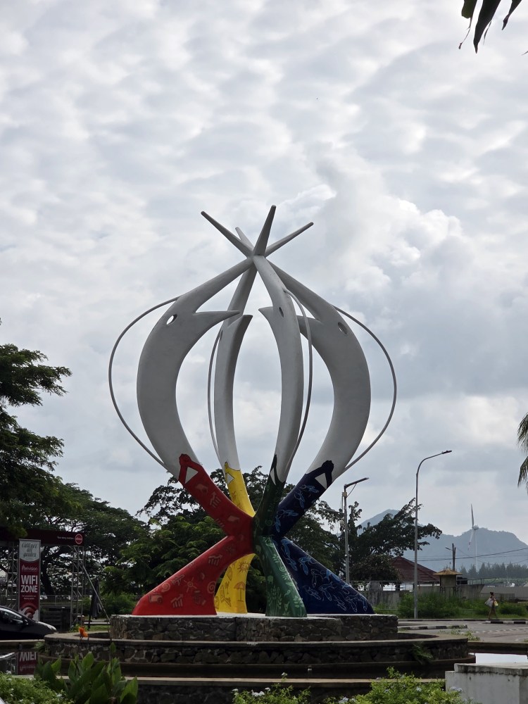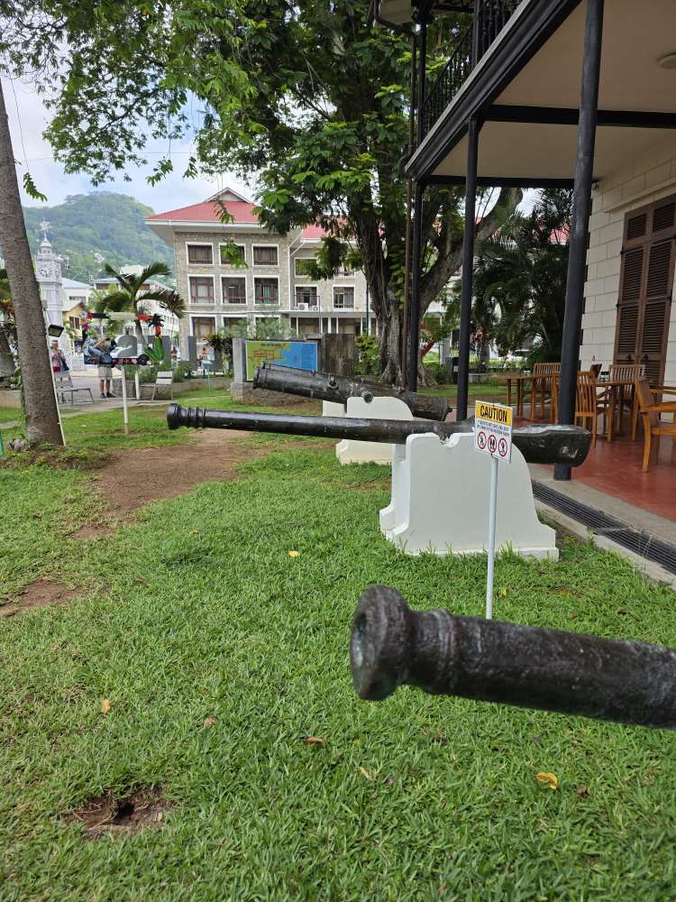 Wandering through the little garden outside the museum, we pass the bust of Pierre Poivre, a member of the first settlement of the Seychelles who introduced “spiked plants” (according to the translation) in particular cinnamon (not pepper as his name would suggest), and doing the touristy thing with the picture frame. Sadly, the museum is not to be – there is a sign announcing it is closed today and Monday for some unknown reason.
