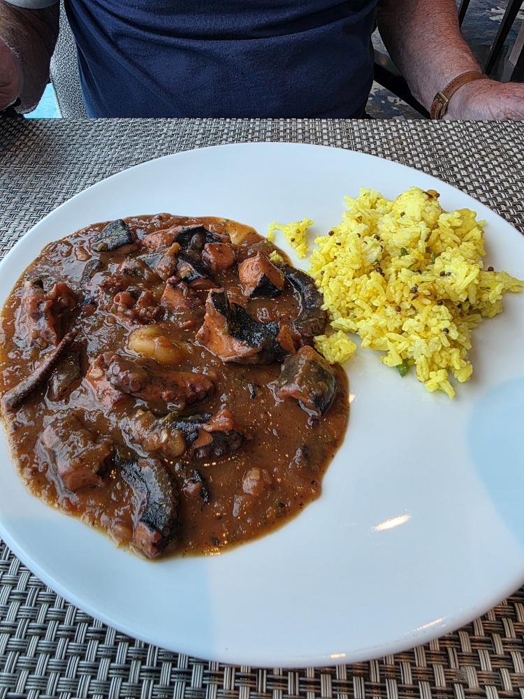 Back aboard, we cool off, hang out for a bit, then head to lunch where Ed has the lunch special Kari Koko Zourit, an octopus dish – with TONS of octopus – typical of Seychelles. The destination lunch specials have been especially great.