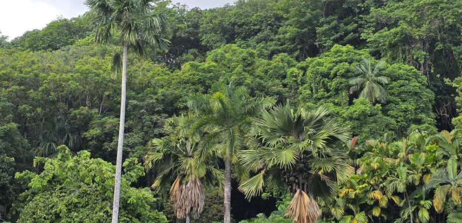 Taking a trail that wraps around the edges of the park, we pass a grove of Coco de Mer trees with their massive coconut-like seeds/nuts, the largest seeds/nuts in the world, weighing up to 40 pounds.