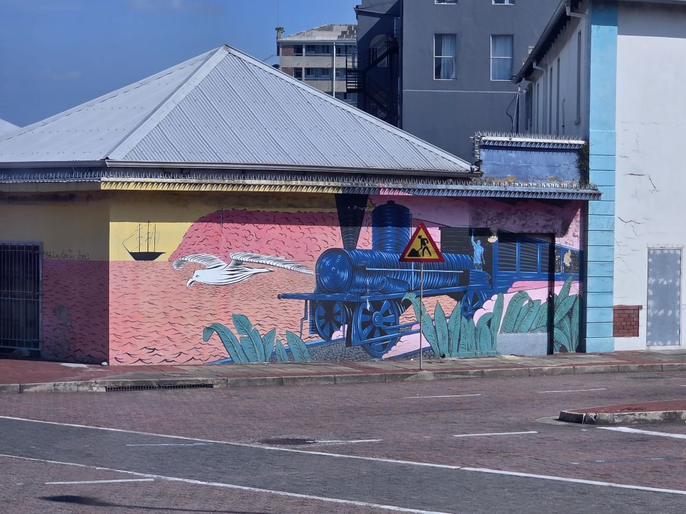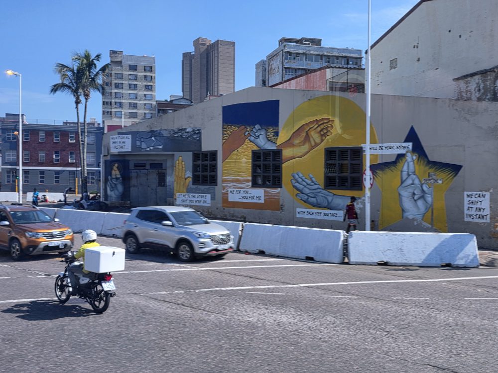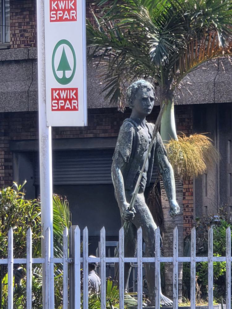 We pass by some nice murals, the commercial and ferry port entrance, stopping by the John Ross house with his statue out front listening to Judith explain that at the age of 15, he walked from Port Natal to Delagoa Bay and back, over 600 miles,, to procure and bring back medical supplies needed by the people of Natal. He later became a trusted advisor of King Shaka.