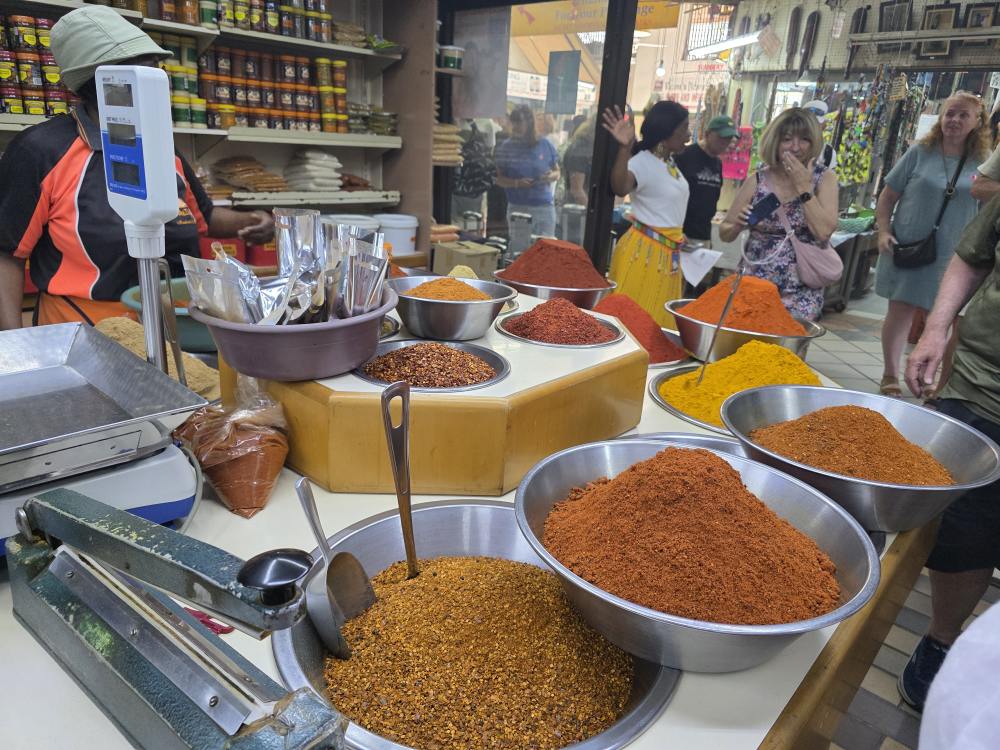 Arriving at the Victoria Street Market, the oldest market in the city, we are given a spice demonstration and talk – including a flyer with great recipes – then have an hour and a half to wander through the stalls of trinkets and souvenirs. After purchasing our Braai spices (cheap!), we wander. And wander. And wander. It is a nice market, tons of souvenirs, none of which we want. Although I did break one of my cool bead bracelets that I bought in Cape Town a while back – so I did want a replacement. We visited 10 stores full of beads and other wood trinkets and carvings, and no one had this particular style of bracelet. Really odd. Then, we hit this one store where the owner knew exactly what I was looking for, pulled out a massive bag full of bracelets – probably 200 or 300 in there – and proceeds to start pulling them out willy nilly to show us. She was the best. Also, after all this time with the bracelets that I wear a lot, she shows me a couple different ways to wear the things that change the looks completely. Wow! That alone was worth the visit. Of course she tries to sell us a million of the bracelets at a really high price, and of course we negotiate, still probably paying too much – but I found an exact match for my broken one, and additional ones to bring home to boot.