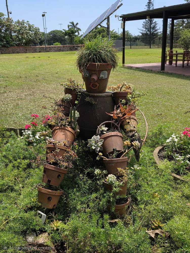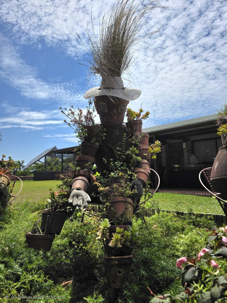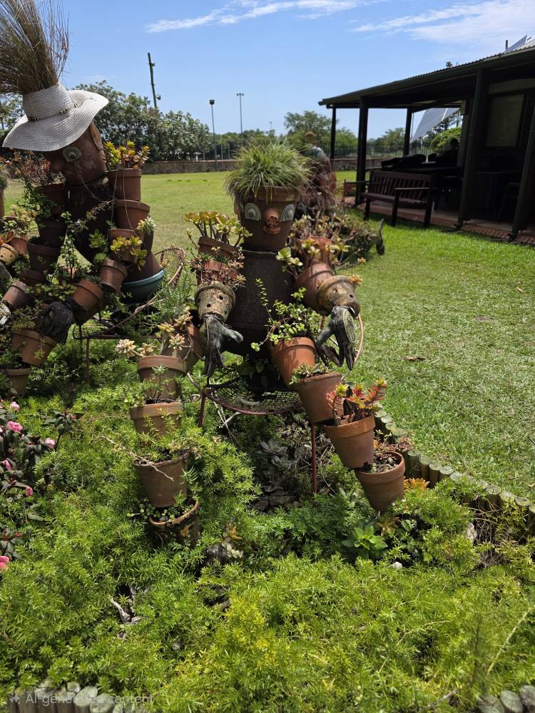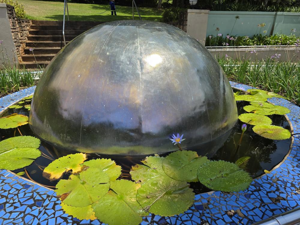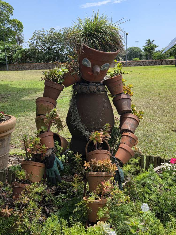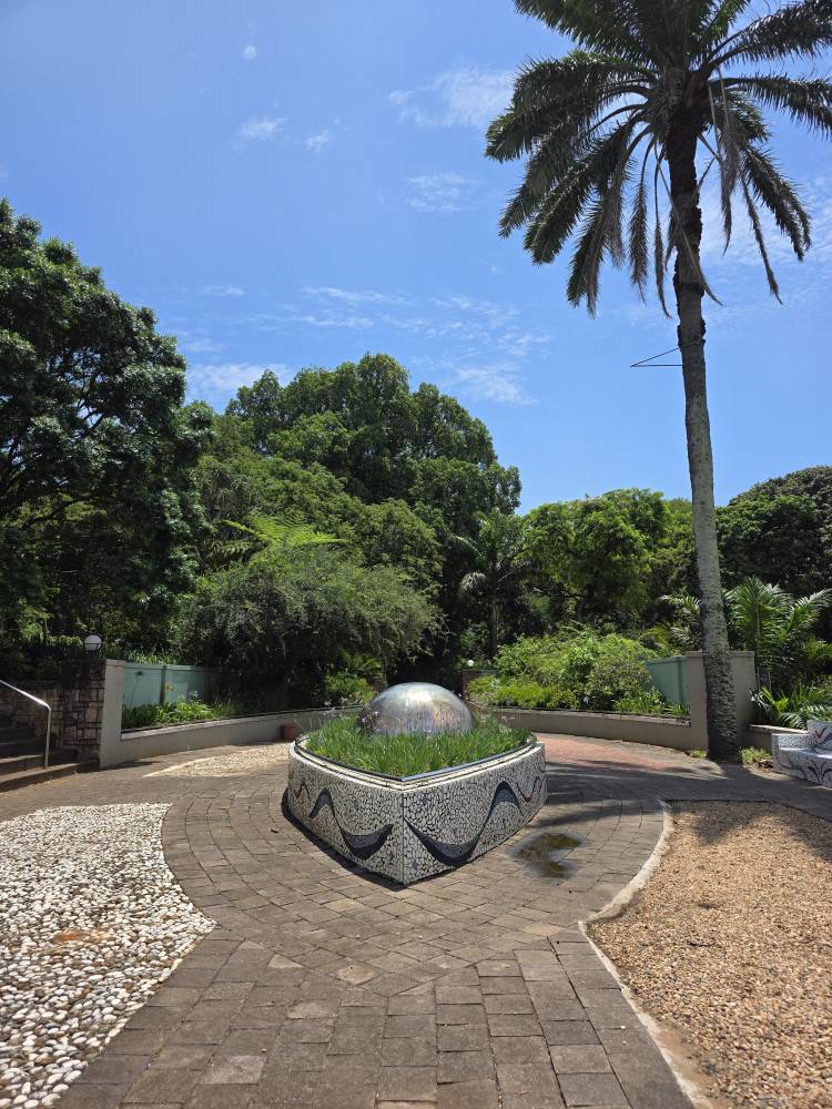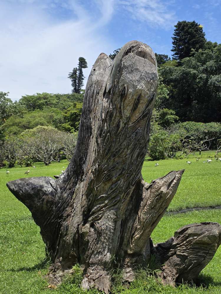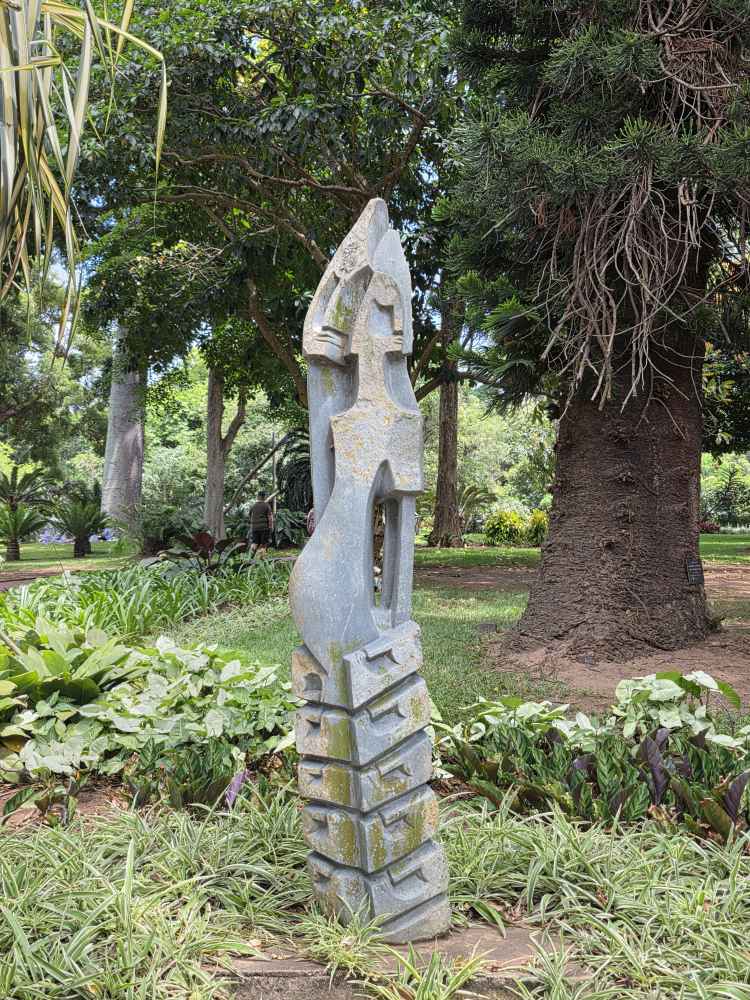 There are good descriptive placards as well, one explaining how the Acacia tree came to be known as the “Fever Tree” – early settlers who caught malaria thought the tree gave them the disease, when actually it was the mosquitoes that populated the swampy area that was the tree’s habitat. Another explaining the Cannonball tree that we had seen previously on Reunion Island – Hindus consider the tree scared as the petals of the flowers resemble the sacred snake Naga. A couple of sculptures – one depicting the annual winter sardine migration along the coast, another the changes on earth.