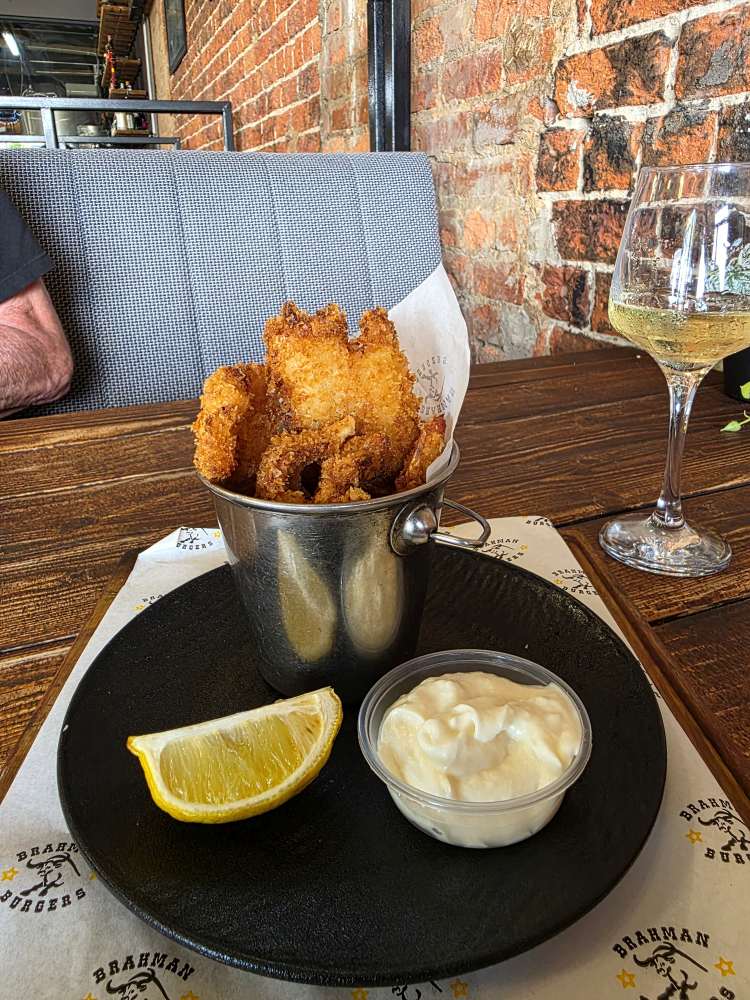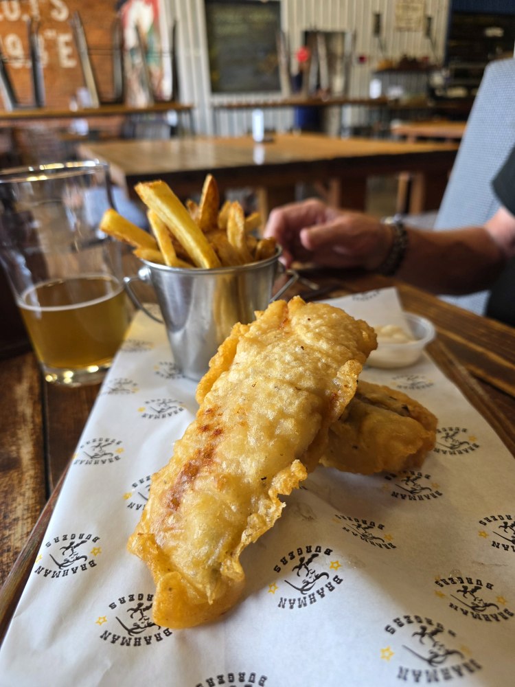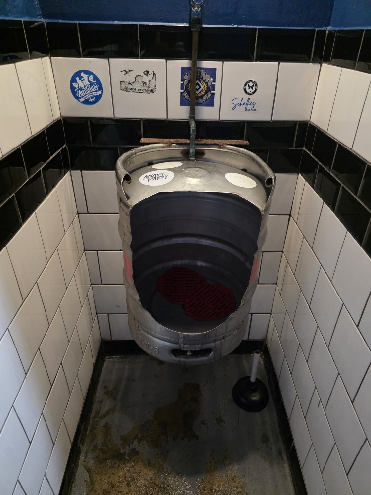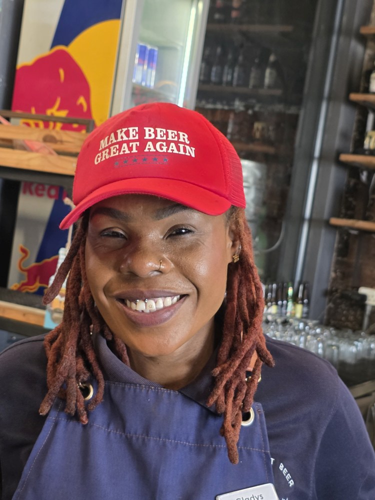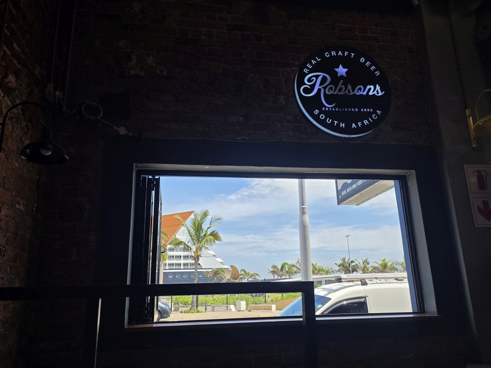 Nice, half day, back at the ship around 12:30. We had planned to take the shuttle over to the mall for lunch – just a little snack since it will be so late – and for a grocery store for gifts, but unfortunately we just miss a shuttle, the next one won’t be here for 20 minutes. It is getting on toward 1pm and we don’t want to wait that long, so instead we head across the street to Robsons Brewery. Perfect! Great beer – I mean, come on, how can you not like someplace with a beer named Miami Weiss? Great pub grub food – I had a Pint of Prawns – really good fried prawns with an excellent garlicky mayo; Ed had a fabulous deep fried Hake, and get a load of the names of the other dishes! I so wanted the Your Buns are No.1 burger, but didn’t want that much food in preparation of our Prime C dinner tonight. Love the vibe of this place – Ed was especially tickled by the urinal – cut out of a keg! And our sweet server, Gladys, and her hat. We now need to find one for Ed!