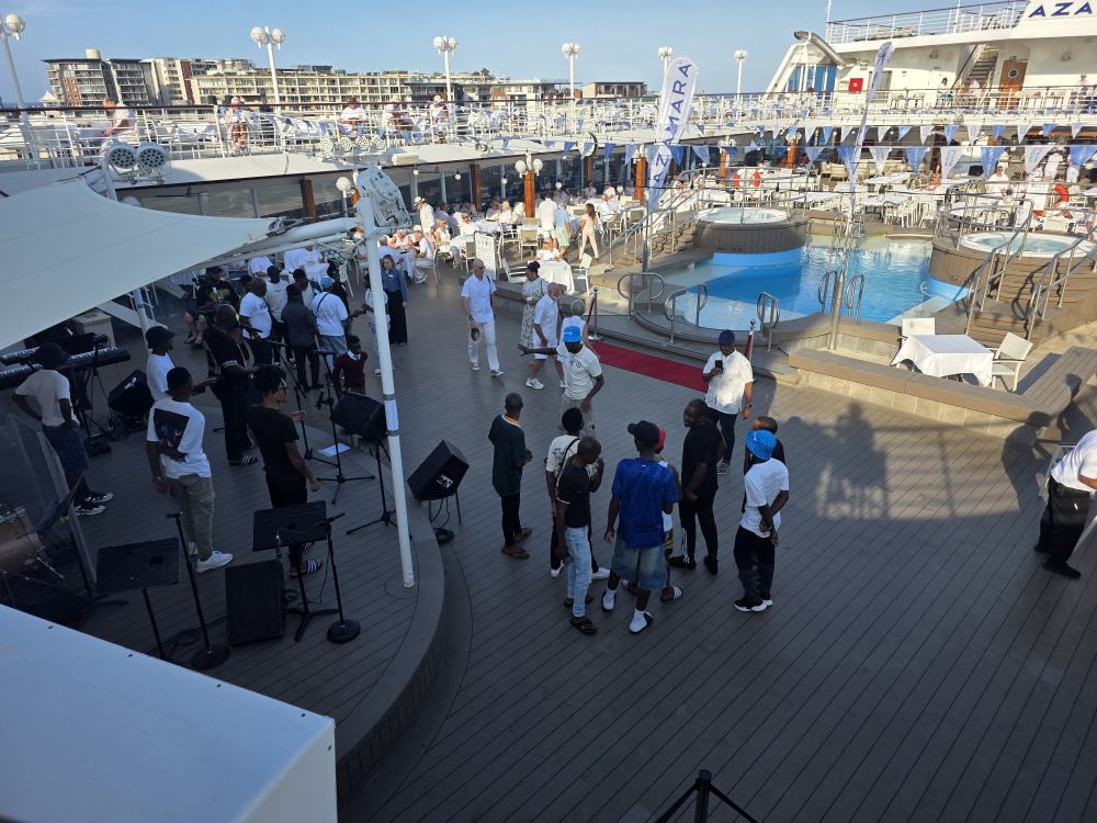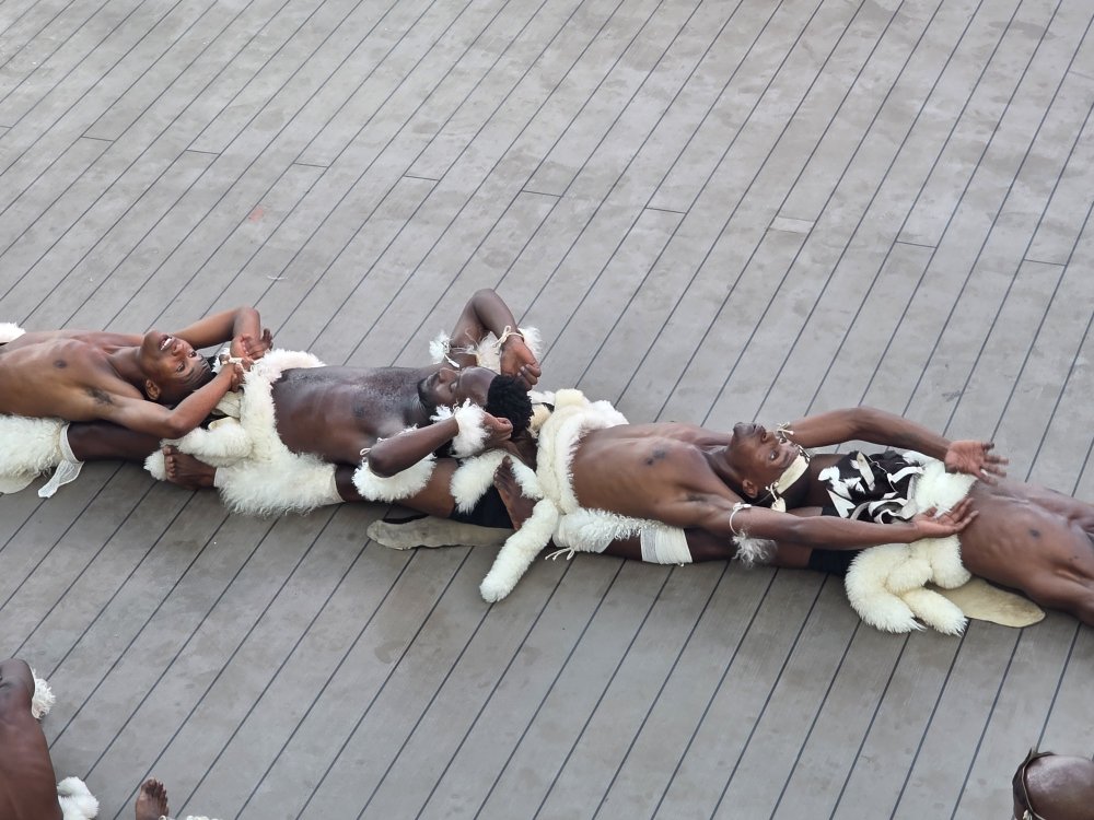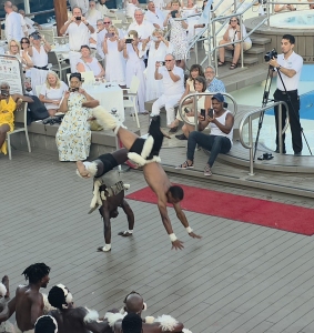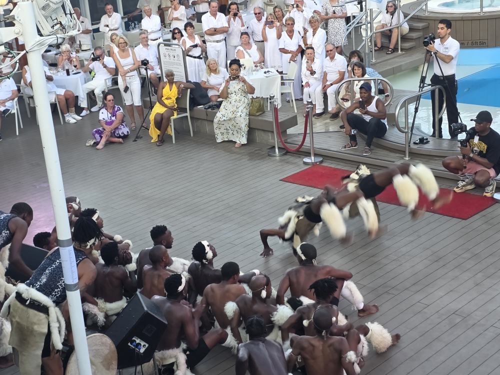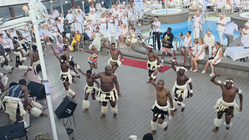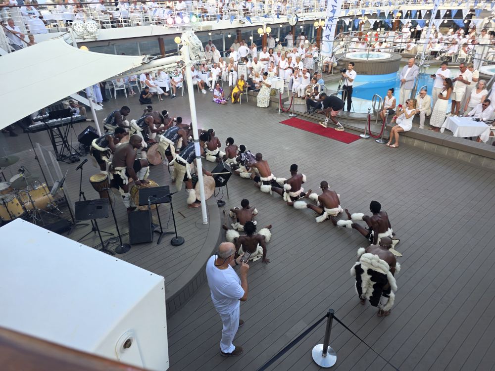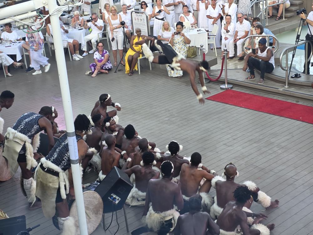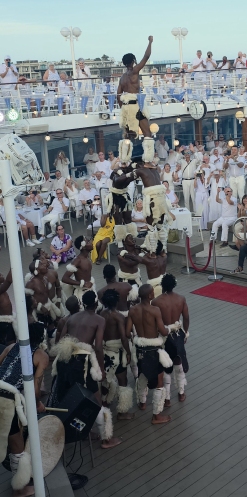 After the gym, we decide to just stay up on deck 10, positioning ourselves at a great 2-top that starts out in the shade, to wait the hour and a half for the Zulu dancer show. We don’t care! We’re just reading and hanging out watching White Night Preparations and keeping ourselves entertained. Otherwise we’d be on the balcony – so why not? Plus, we are also in the prime spot to watch all the performers come by as they go to the Drawing room to get changed into their costumes. Fun. (The only negative? We are right over the grills – where they use wood that we think are old paint brushes as kindling starter – then proceed to torch the charcoal to death to light it, meaning we get the smoke right up to us and our clothes will forever more smell like White Night BBQ! The price you pay for good seats…..)