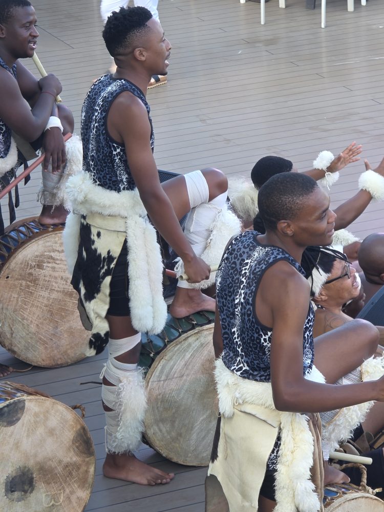 The Zulu show is excellent. Those guys are just amazing, so acrobatic and the way they flip and then flop on the deck? That’s gotta hurt, but apparently they’ve got a way to do it without major damage! And the one female artist has the voice of an angel – so great. We have a wonderful time sitting up top watching – and swatting the stupid woman away who is standing behind our table and picks up Ed’s beer bottle to move out of the way for a photo. What? Lady! Honestly – you don’t EVER touch anyone else’s drink that way. People.