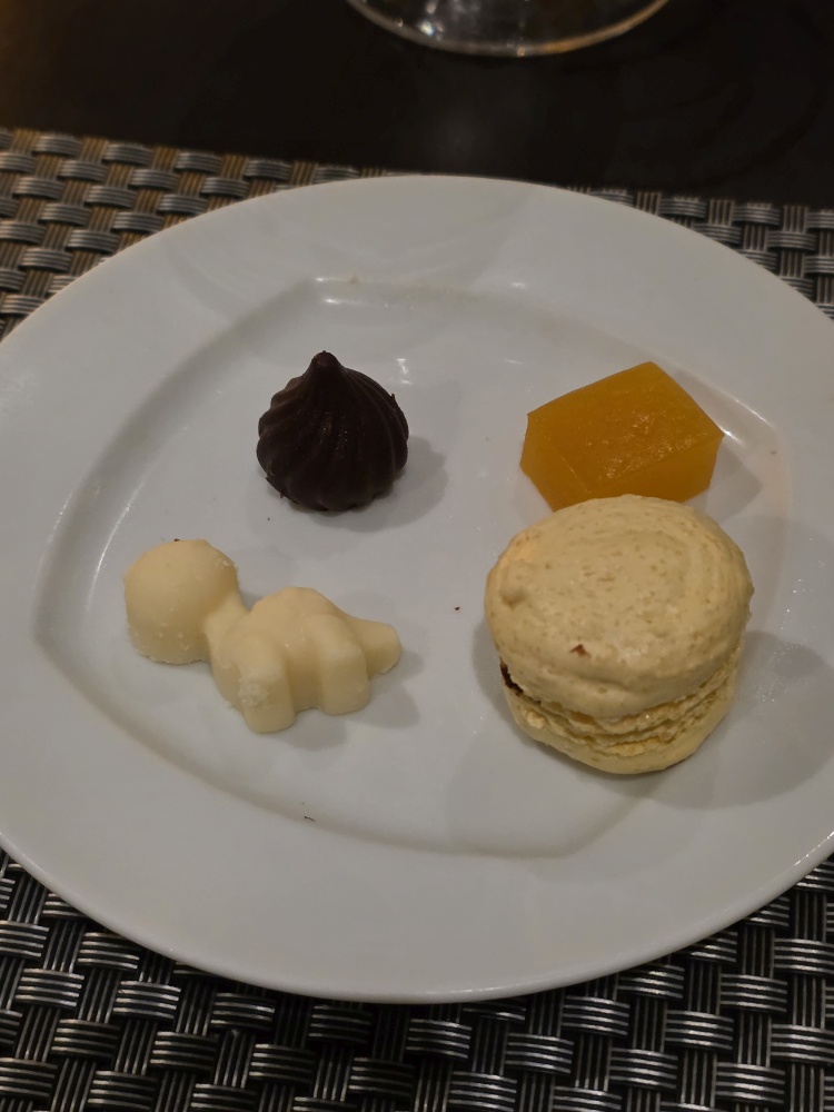 We linger so long on the balcony we are almost late for our Aqualina dinner! But not to worry, Jeannie is there for us – no window table tonight as they are full, but we don’t care. We have a very pleasant meal – the lamb is wonderful tonight – and then for our petit fours, I am served a little white chocolate dinosaur. So cute!
