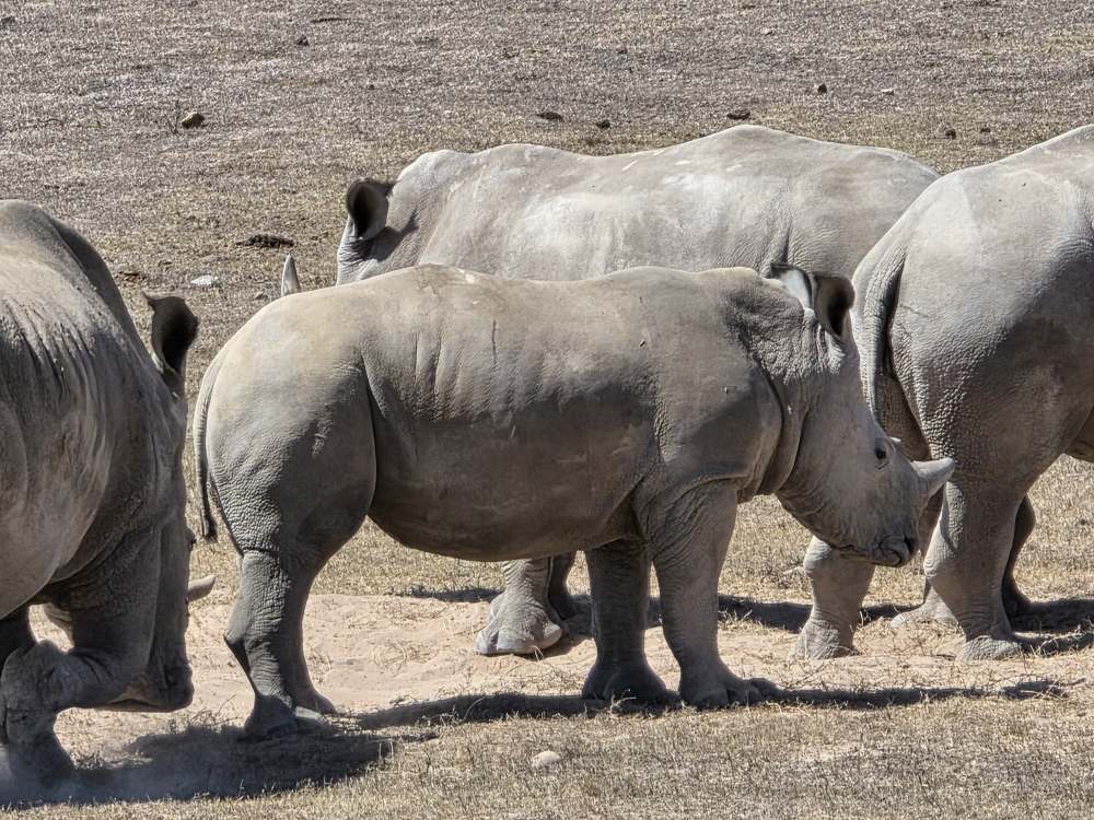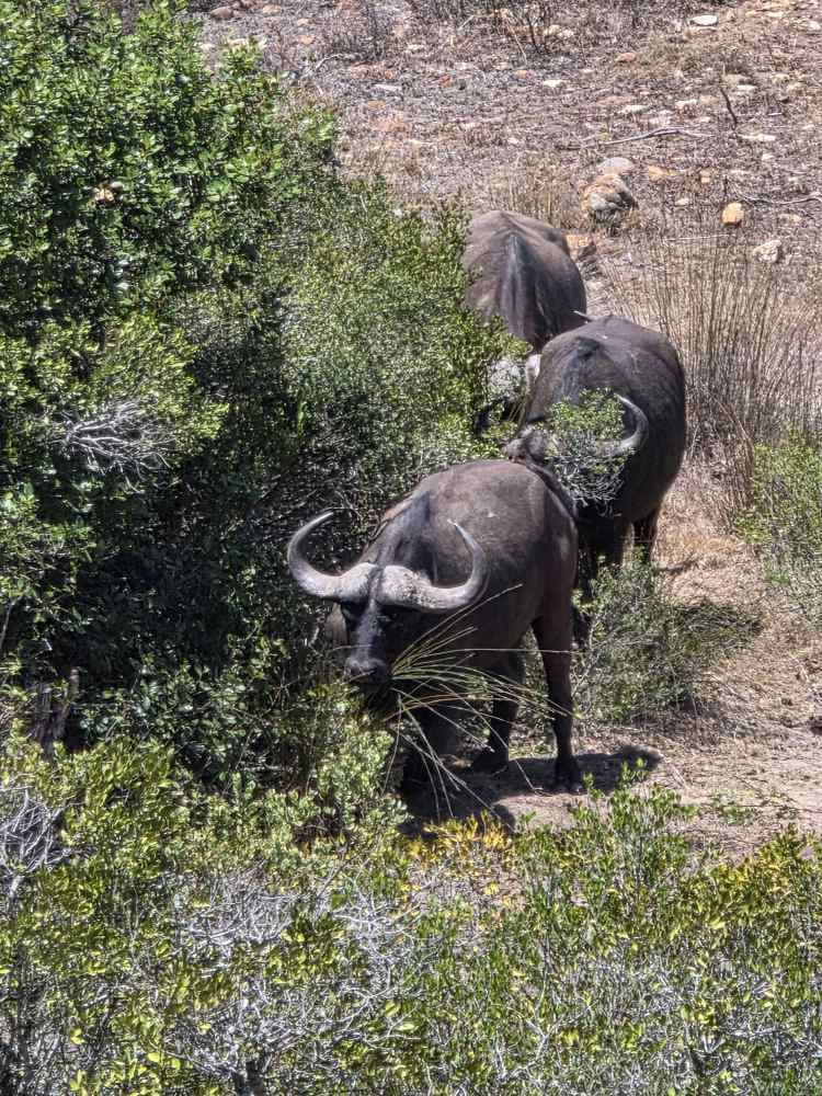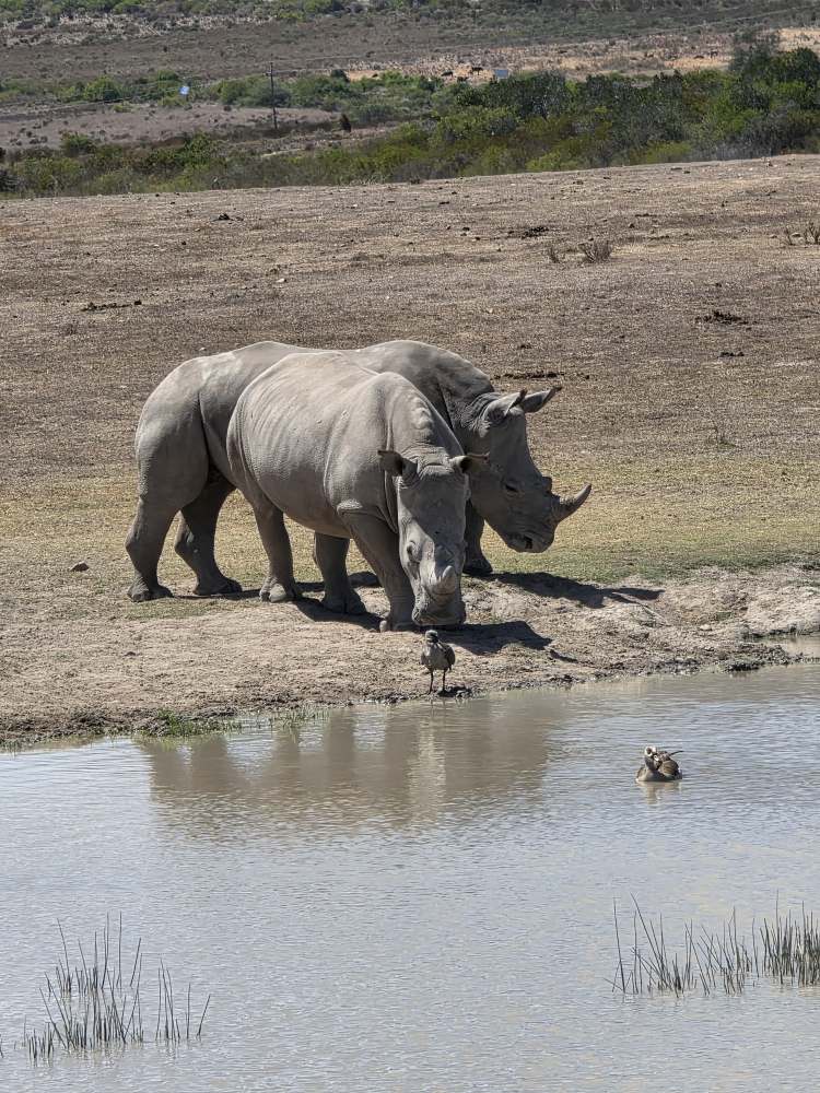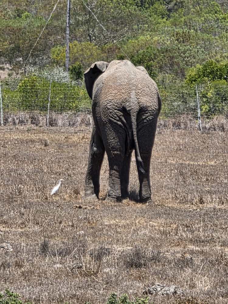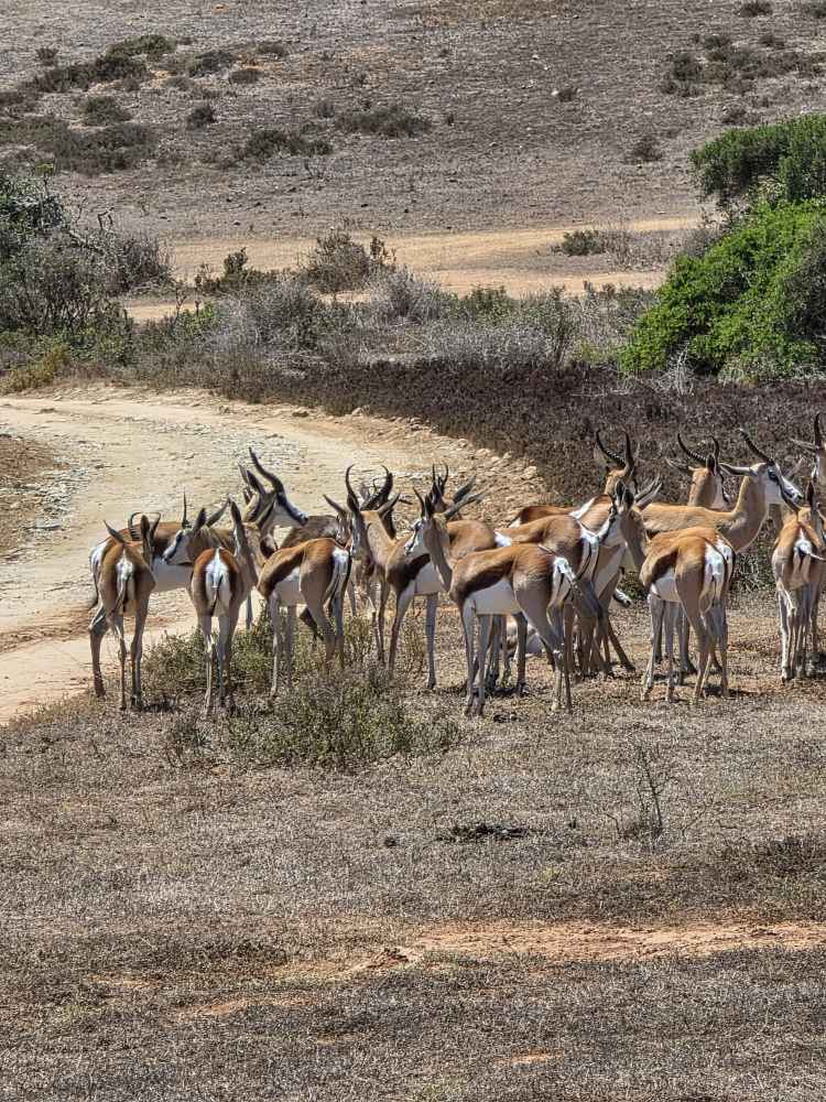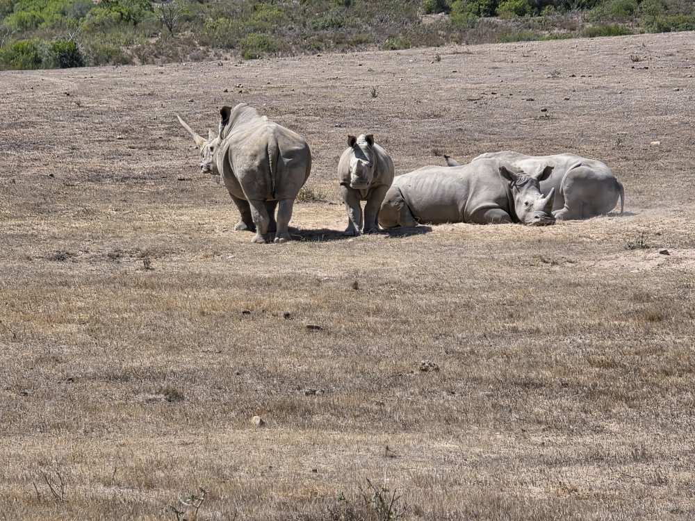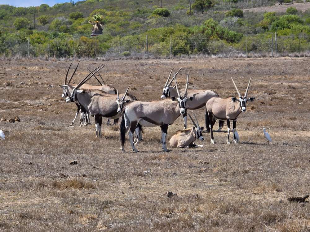 So, we have a very leisurely morning, then head down to Cabaret to wait for our tour to be called and hit the tender platform. First on the tender, great seats by the door to watch the seals frolicking in the harbor. First off – and still we don’t have the front seat as there are people already there. Yeah, yeah, yeah, not like we haven’t done that ourselves. And truly we don’t care today, it’s the game drive that matters. We have a lovely guide named Ericka, originally from Switzerland, 45 years ago! Came here for one year, and well, you see how that went! She gives us the background on Mossel Bay as we go – which we’ve heard previously – 70,000 population, doubles in the summer with everyone here camping at the campgrounds. Very much a resort/vacation type place. She explains some of the animals, things like: antelope have horns, not antlers; White rhino was so named due to confusion over translation and language, the first Dutch settlers here called it a wide-lipped rhino, but in the translation it ended up White rhino instead; The black rhino is called black simply to differentiate it from the White, the only difference being a hooked lip; both rhinos are grey.