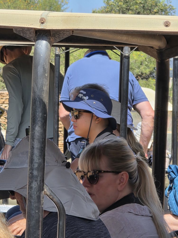 After a restroom stop and refreshments, we head out to the game vehicles, scoring the back seat and setting off on first. One interesting note, Lomou is here and on the other tour bus, which we think is absolutely great. We wanted him to come with us, but we don’t know the protocol of him staying with his bus, so we settle for waving to him every time our vehicles meet and surreptiously taking this picture of him on the game jeep (he’s the one in the blue bucket hat).