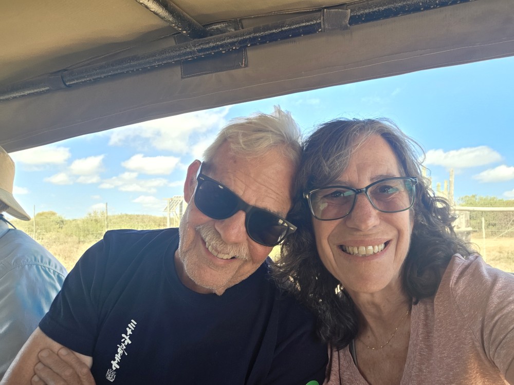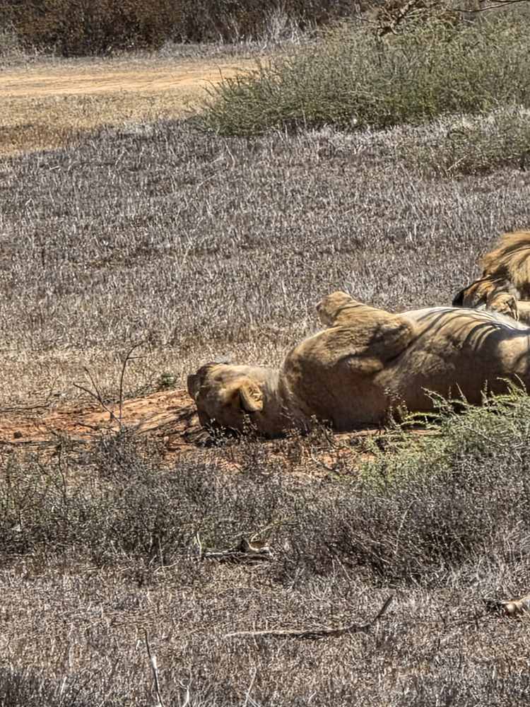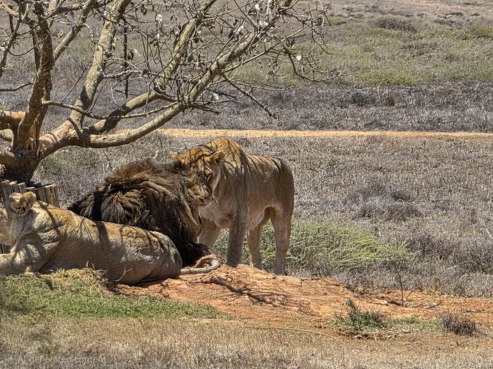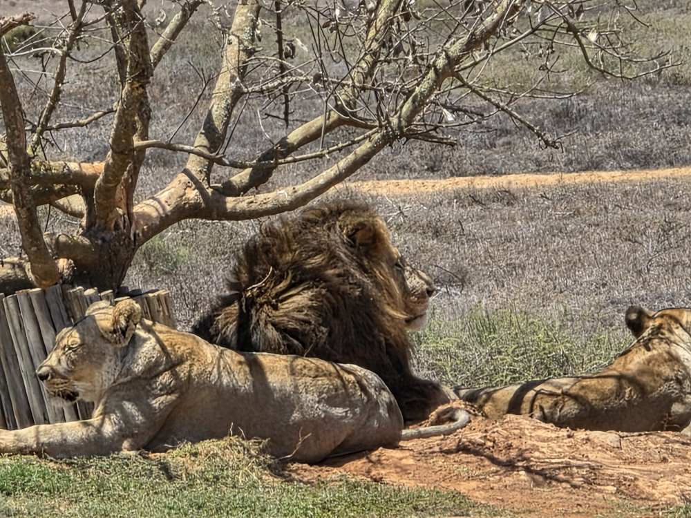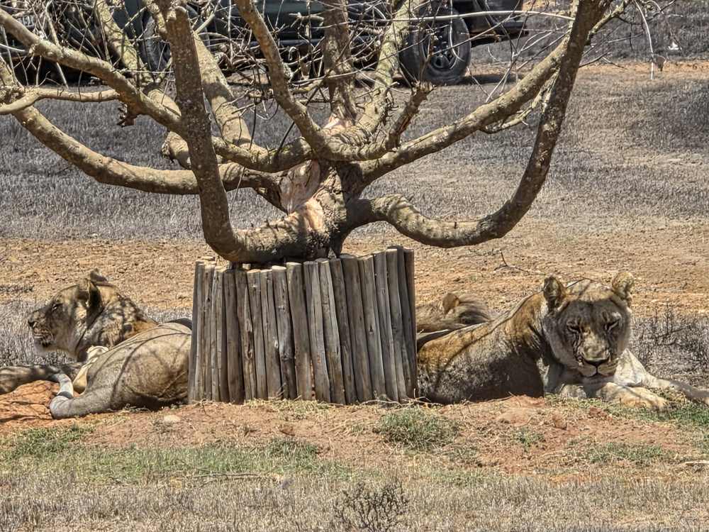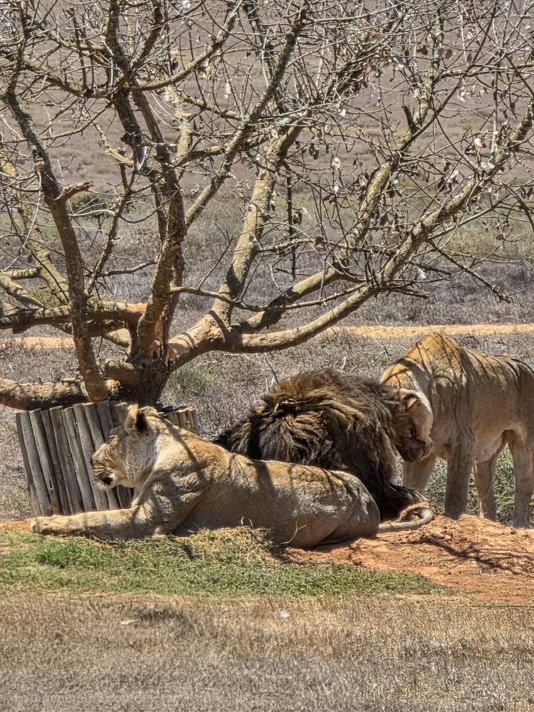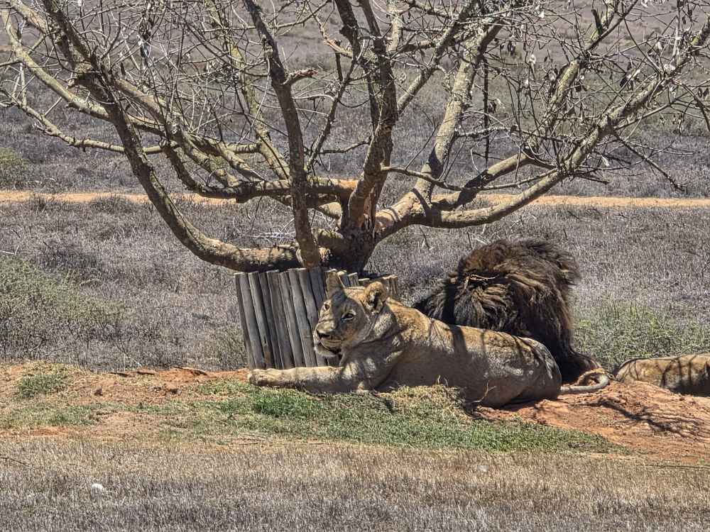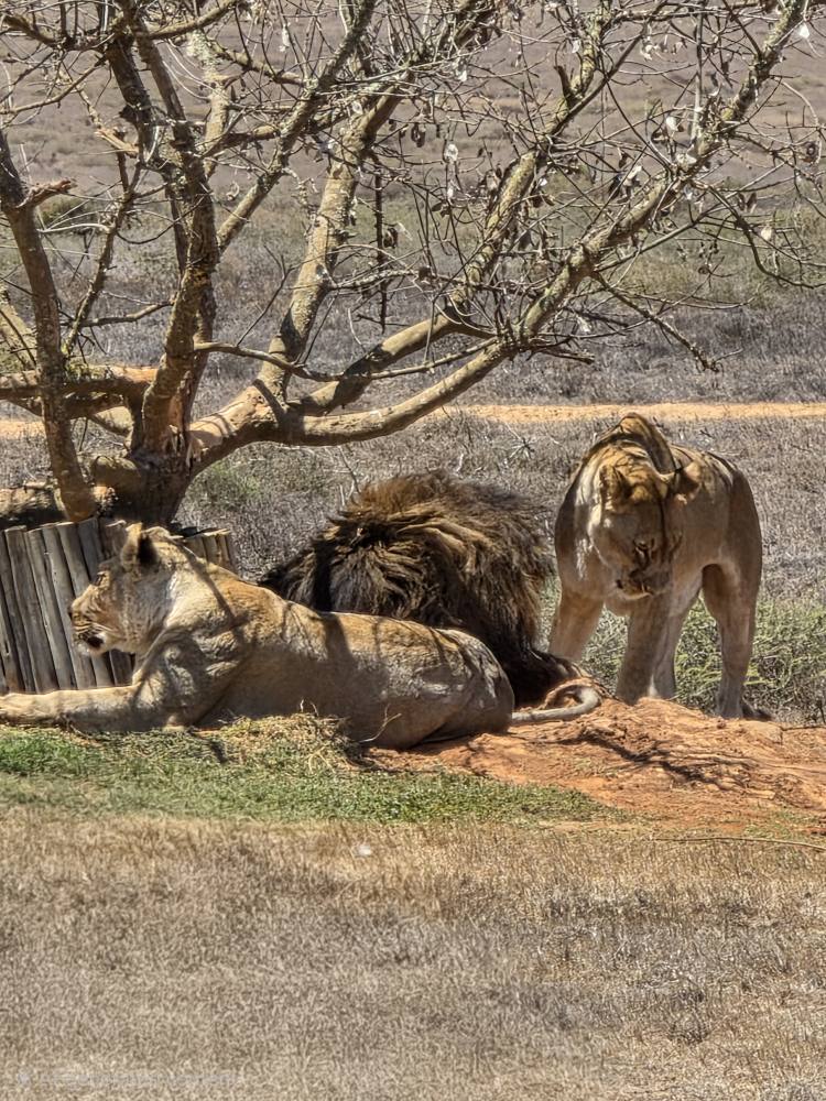 The lions aren’t doing much and we can barely see them, so Able pulls around to the back side of the tree and starts revving his engine. Apparently this reminds the lions of the jeep that comes to feed them – Able says they know the sound of the jeep and come running over to the fence in anticipation of its arrival – because they perk up and lift their heads looking at us! Yay Able! The male even lifts his royal full mane head looking about – beautiful. So King of Jungle-ish! Then one of the females gets up and rubs heads with the male, like they are kissing. A pure Kodak moment.