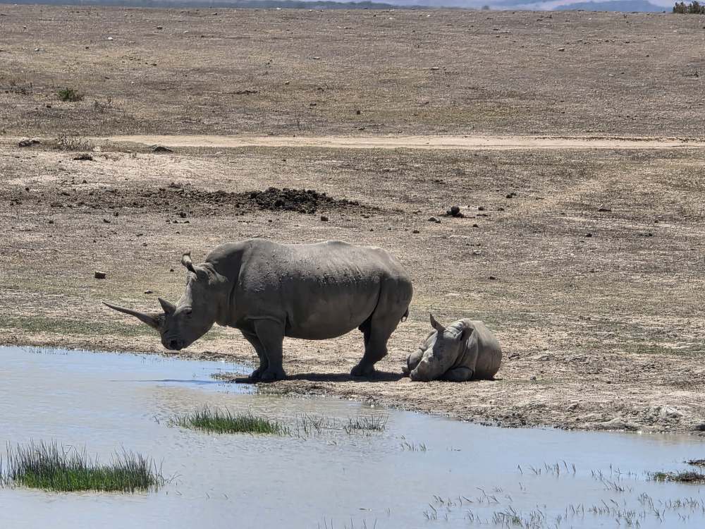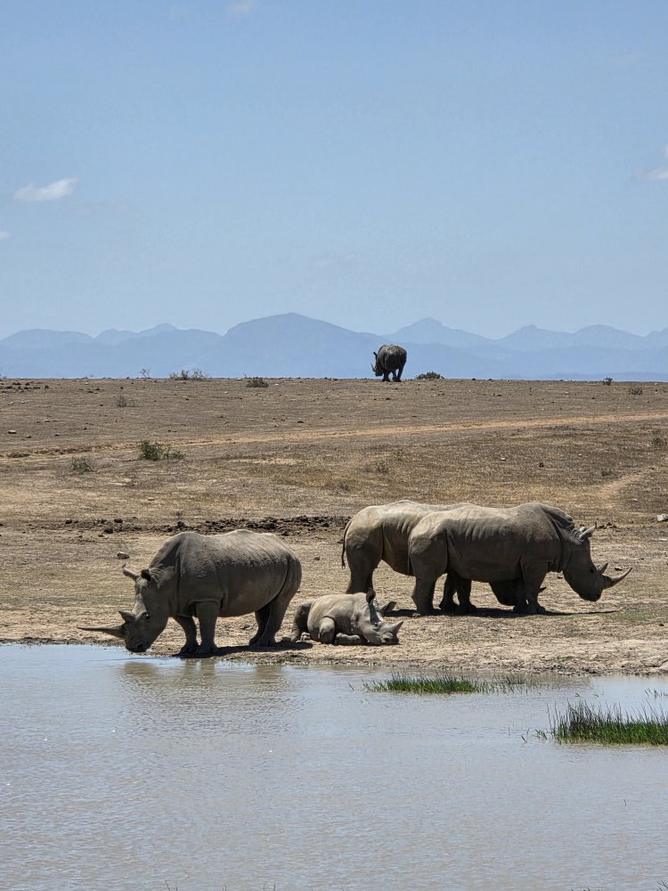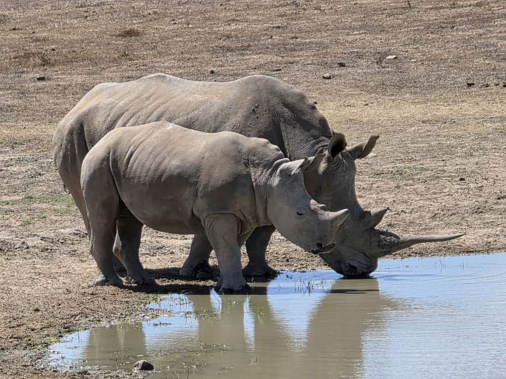 Which were White Rhinos. A herd of 5, including a baby. They were pretty active when we were there, first lying about, then moving toward the water hole with a bathroom stop. The interesting thing here is that they literally go to the bathroom – in the same area always. One after the other, they come over from where they were laying to do their business in the bathroom area before heading to the water hole for their drinks. Amazing.