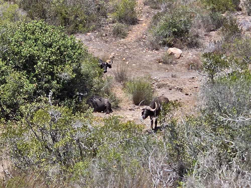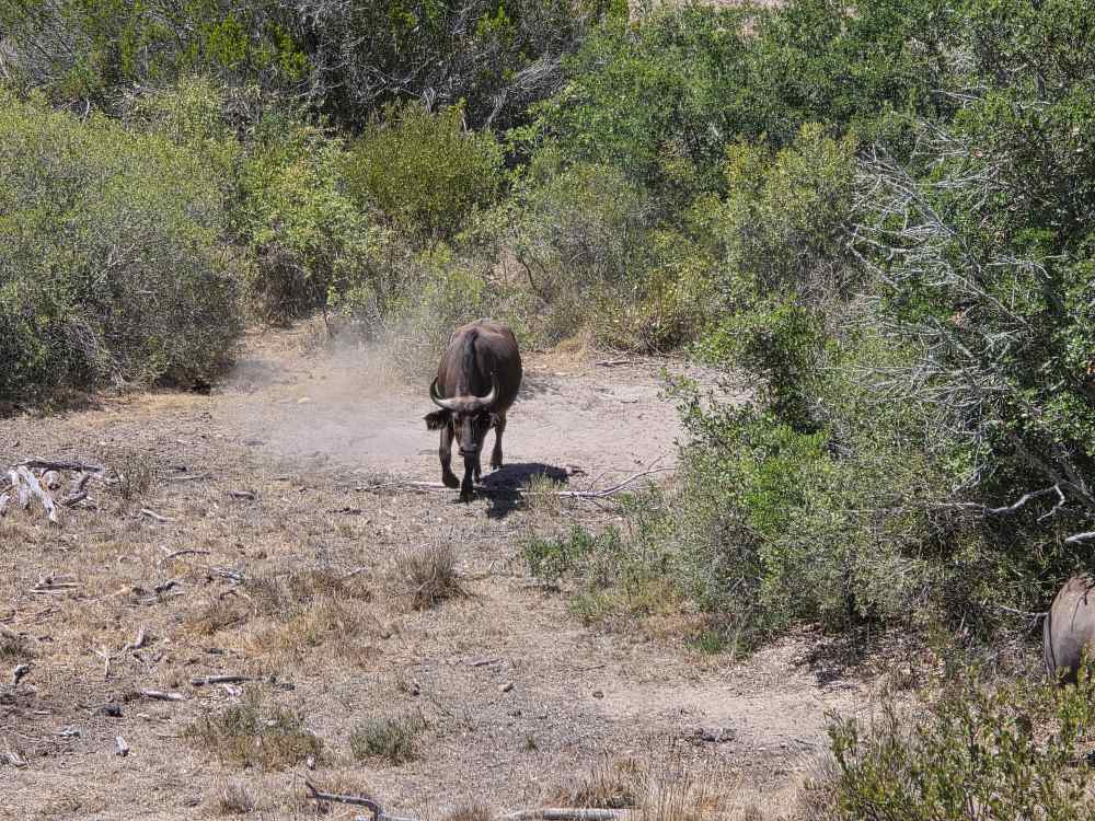 We loose our lead when Able goes off in search of who knows what in the middle of a thorn bush field, but double back to find the Cape buffalo down in a little ravine near the streambed. So scary and mean – the meanest of the Big 5.