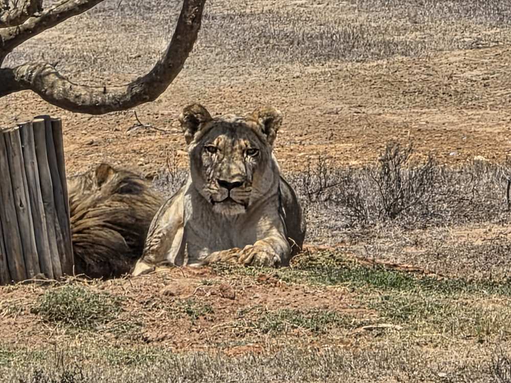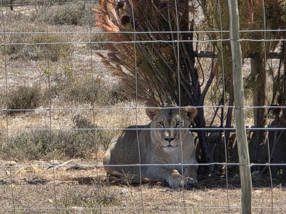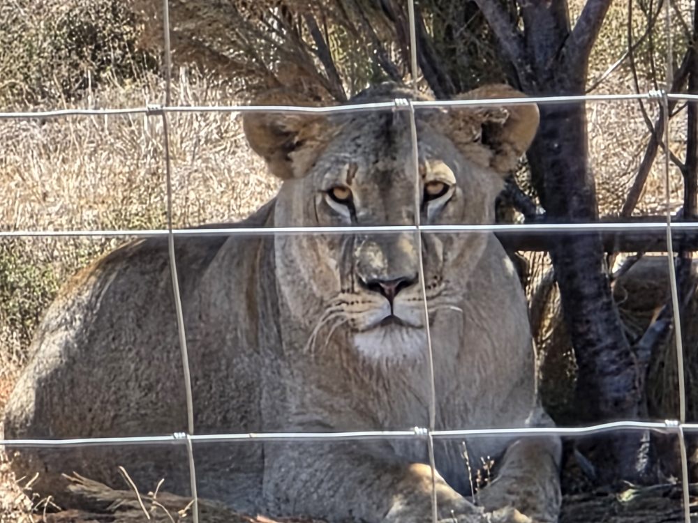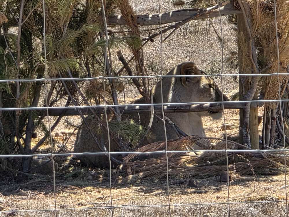 Off we go through the different landscape, up and down hills on sandy tracks, through gates, entering into different sections of the preserve until we reach the quarantine area where 3 female lions await introduction in the rest of the pride. They have just arrived here, maybe a week or two, and are getting acclimated to their new surroundings before integration. Very zoo-like in these pictures.